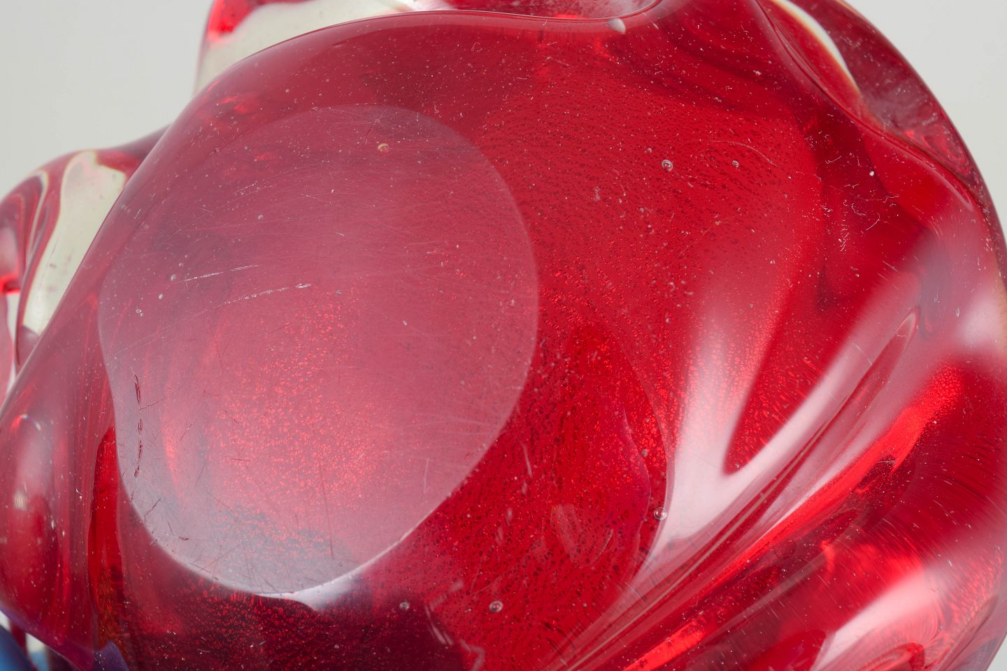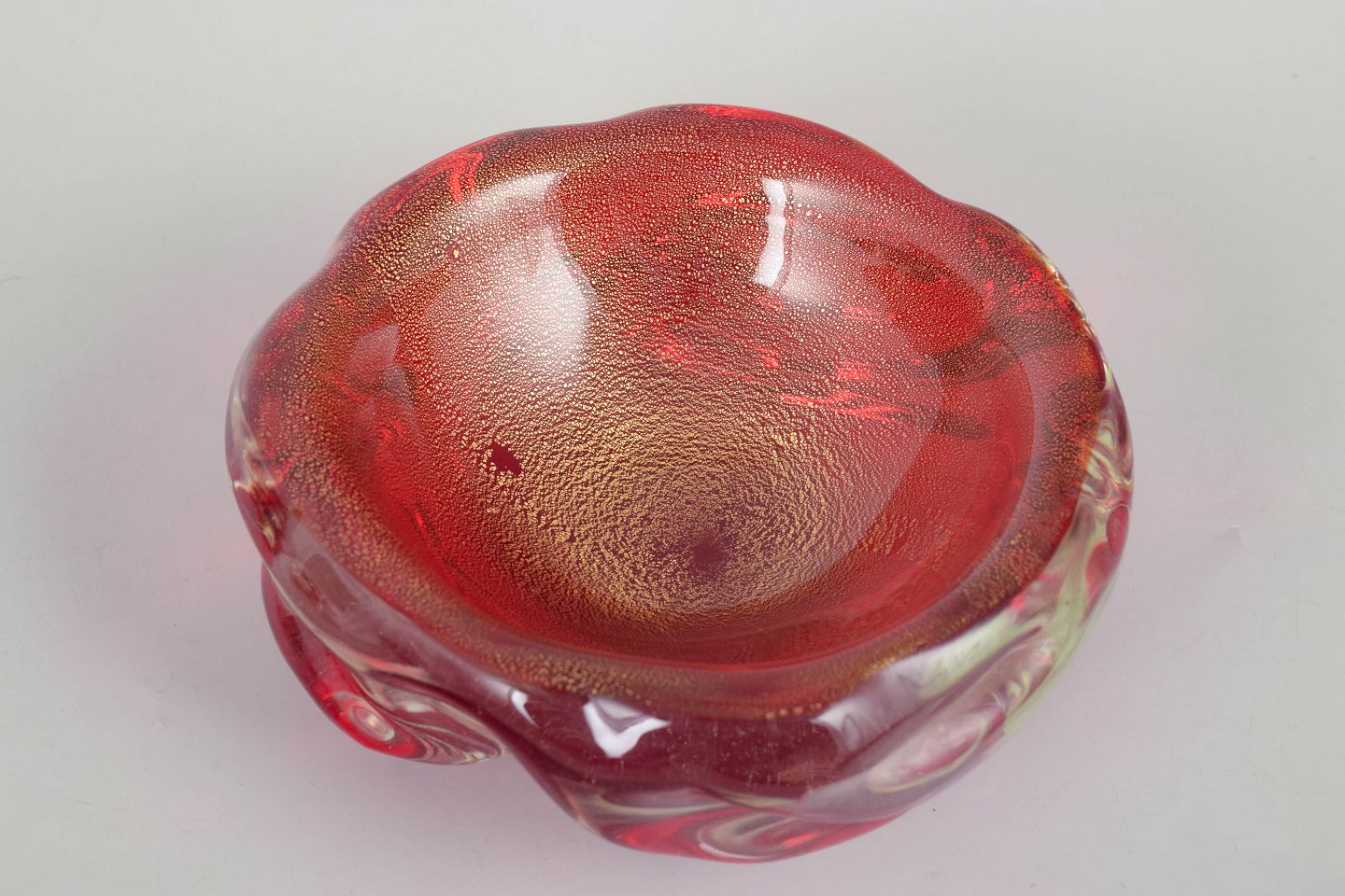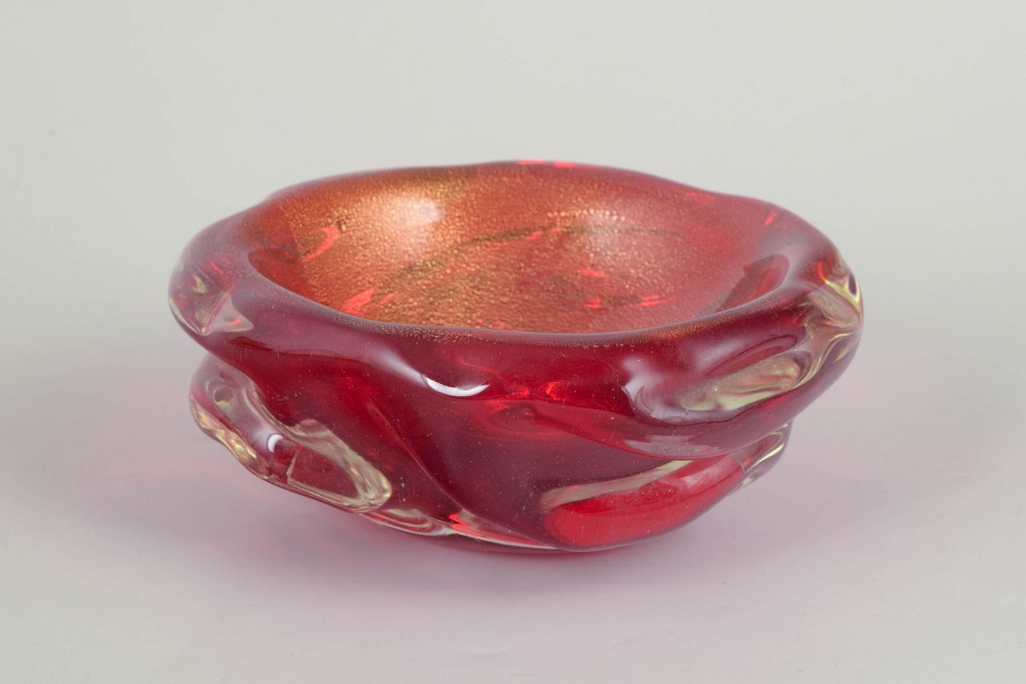 Murano, bowl.Heavy art glass bowl in red glass with iridescent surface and freely formed organic rim, characteristic of Murano’s sculptural mid-century glass production.