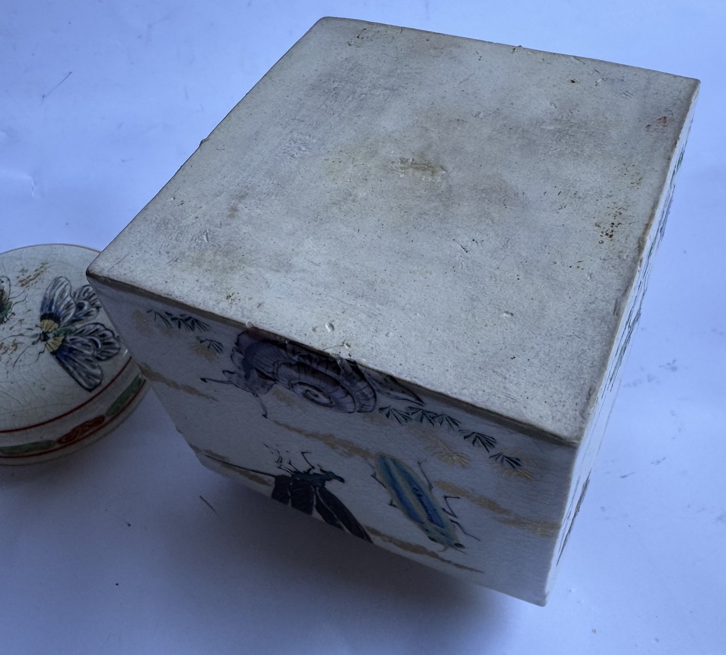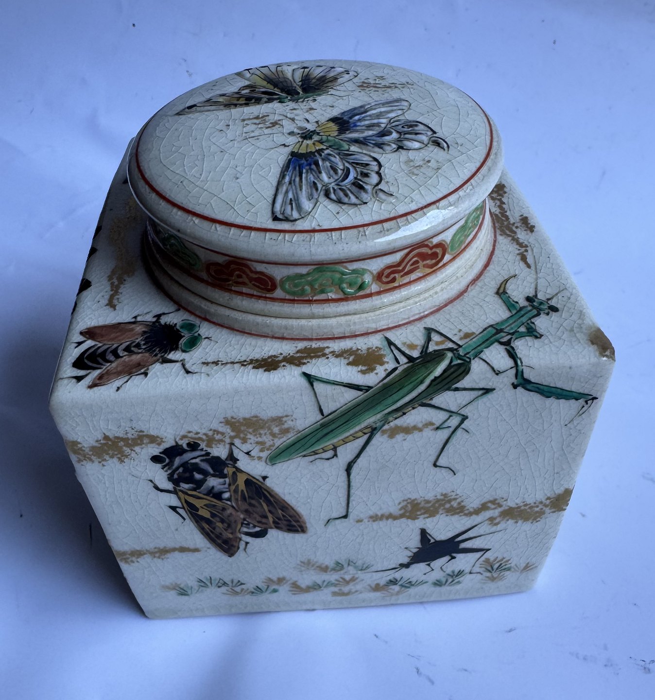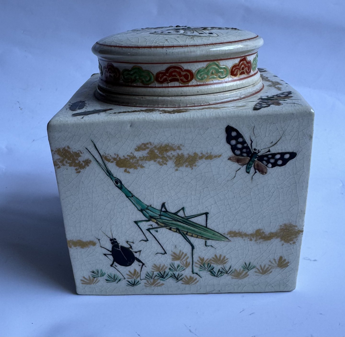Square tea caddy in faience from Japan produced around 1910. Beautifully decorated with insects on all sides and on the lid. Unknown factory mark stamped on the bottom. Apart from a small scratch on a corner (follow the grey arrows) there is nothing to note. Dimensions: H. 10.7 cm and 9.5 x 9.5 cm. Dealer