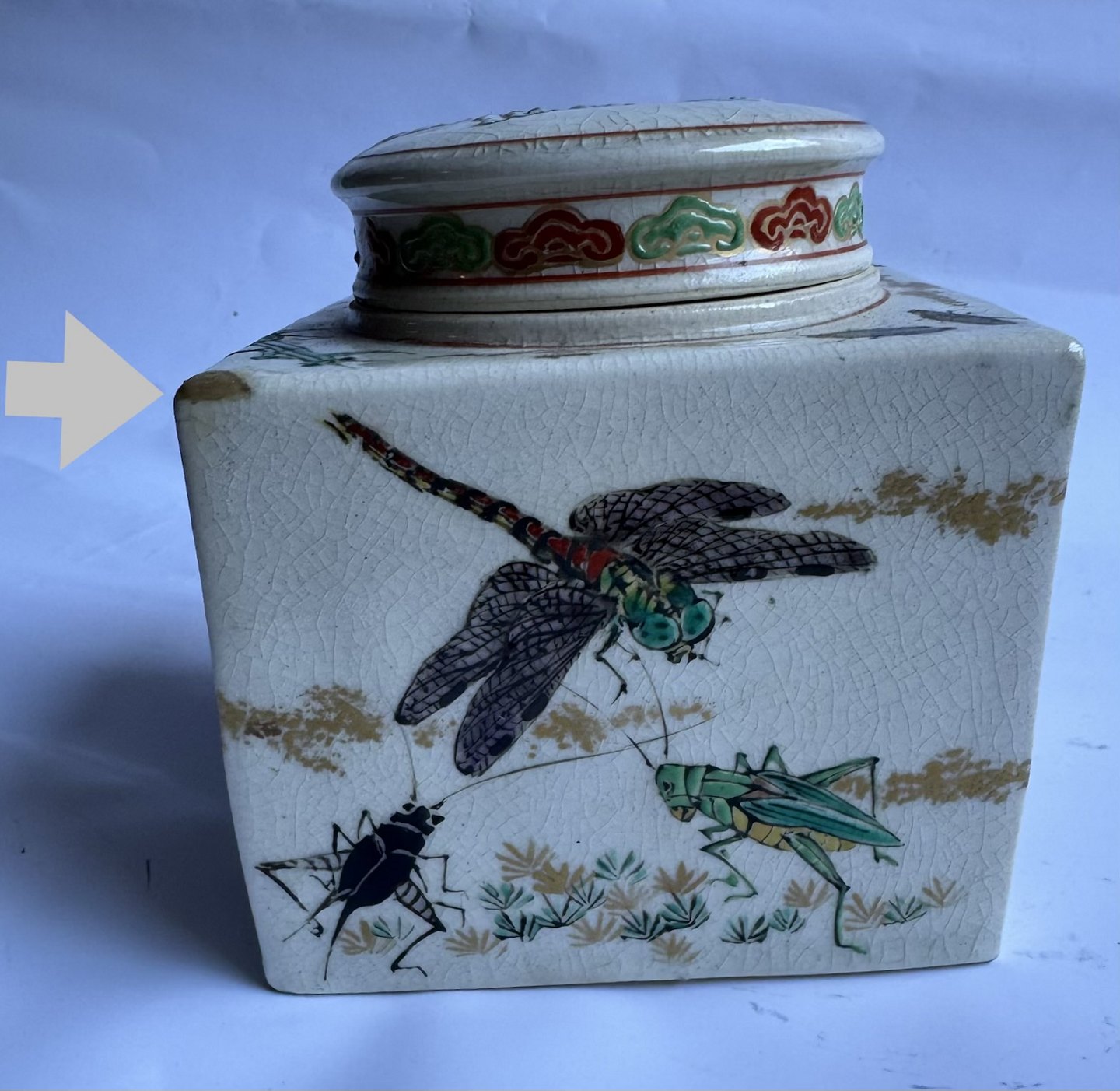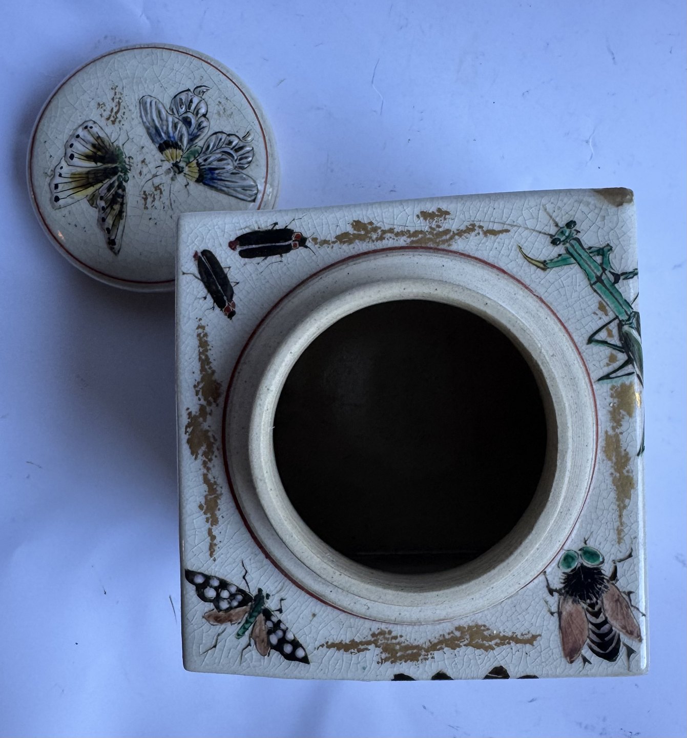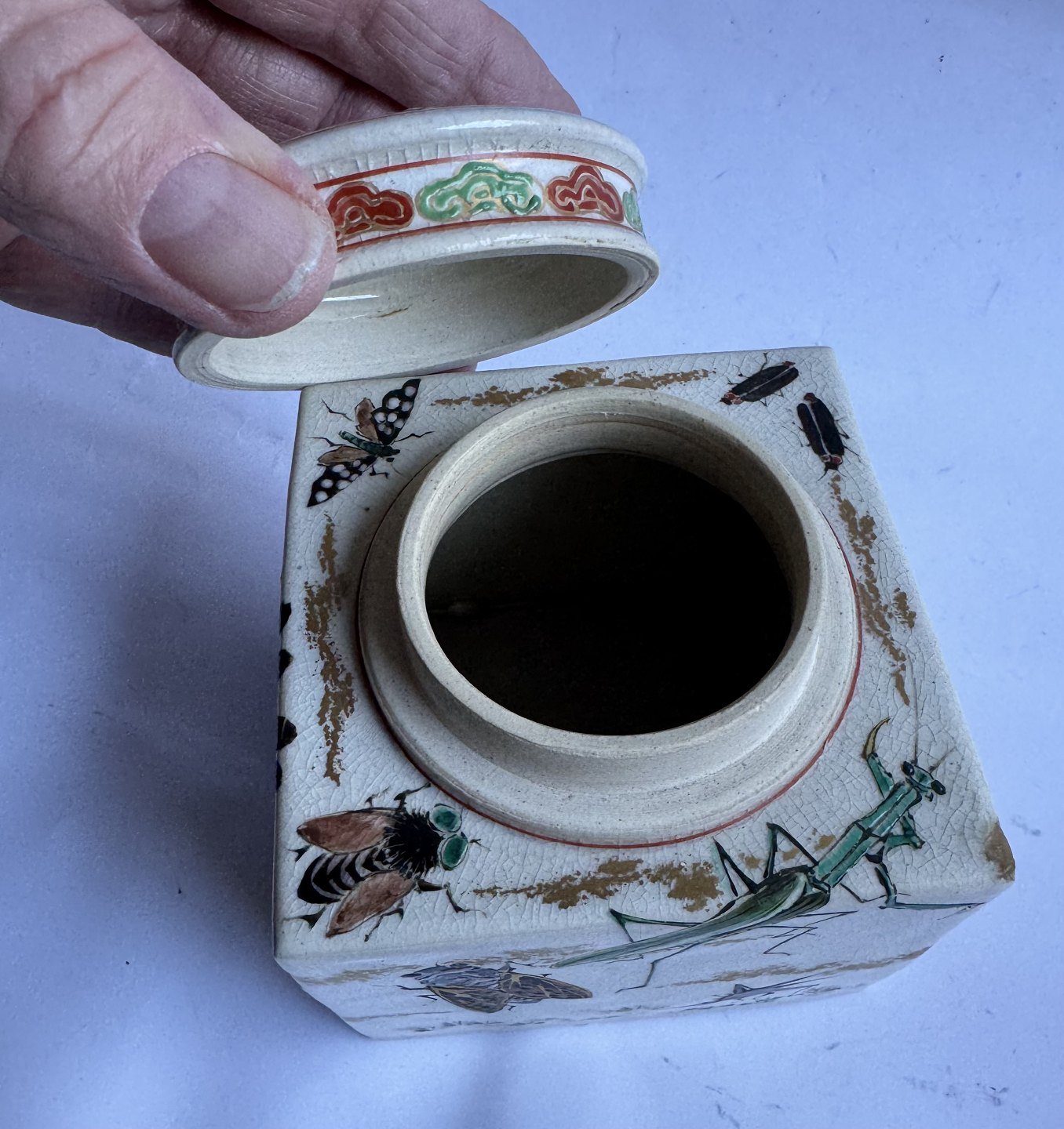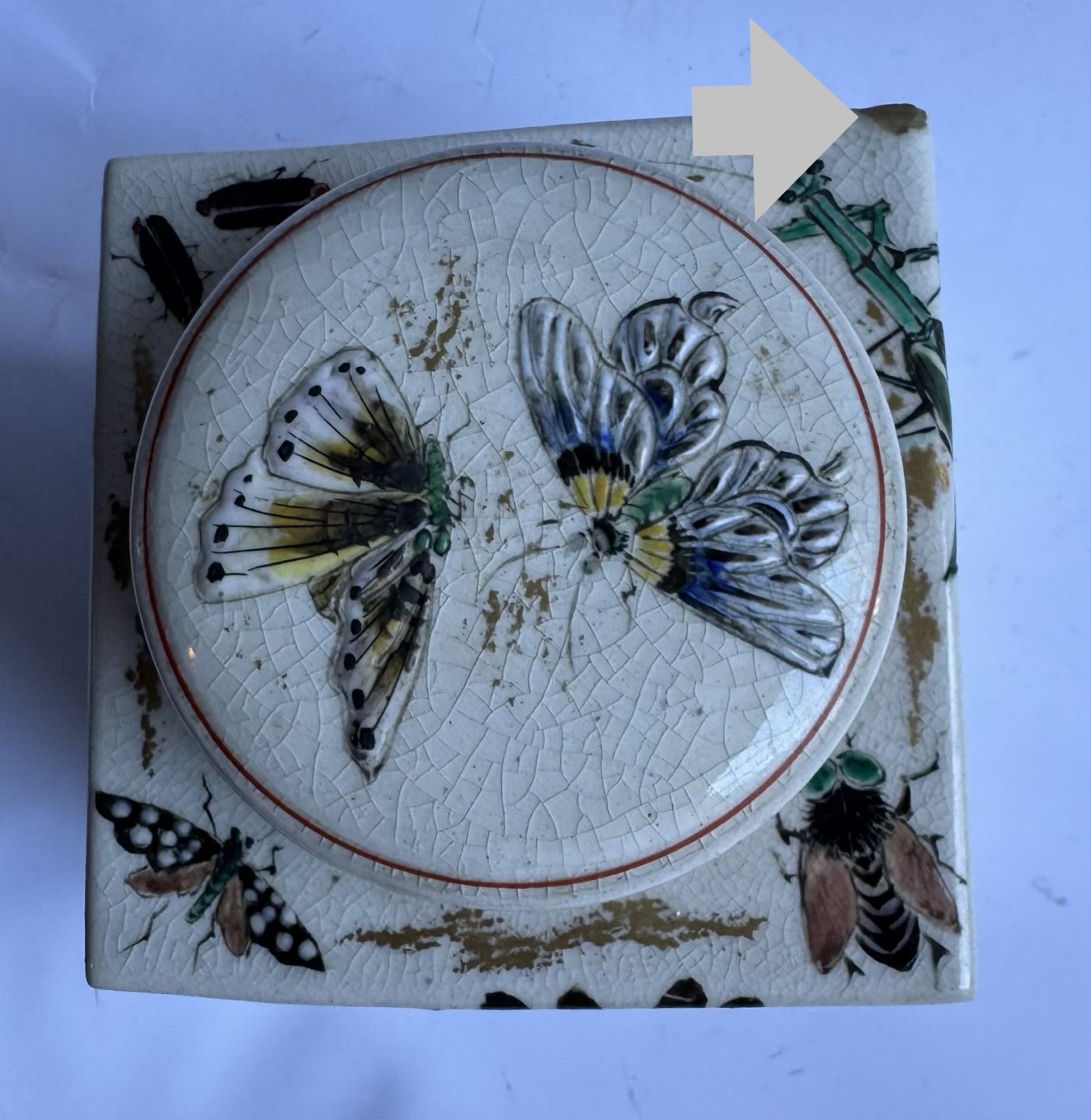 Square tea caddy in faience from Japan produced around 1910. Beautifully decorated with insects on all sides and on the lid. Unknown factory mark stamped on the bottom. Apart from a small scratch on a corner (follow the grey arrows) there is nothing to note. Dimensions: H. 10.7 cm and 9.5 x 9.5 cm. Dealer