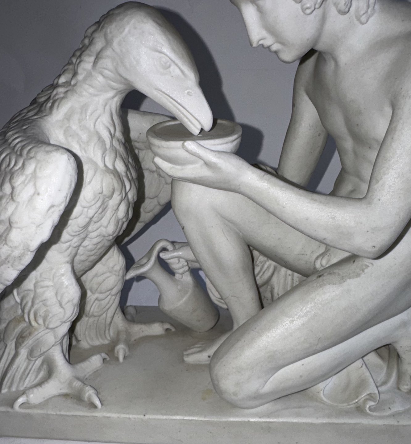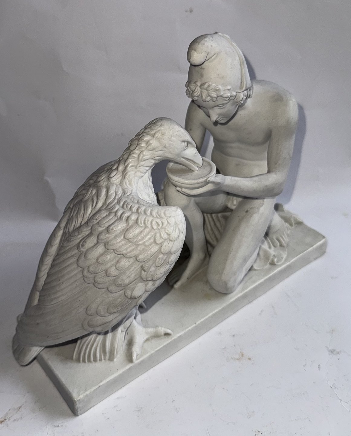 Bing & Grøndahl figure in biscuit depicting Bertel Thorvaldsen's version of Ganymedes with Jupitar's eagle. Made in the late 19th. century. Do have a small chip on the bottom rim of the base. Otherwise in good condition. Factory mark on the bottom of the base with B&G in blue. The figure is 20,5 cm high and 26 cm long. The base measures 9 cm x 24,5 cm. Dealer