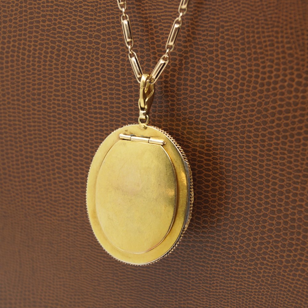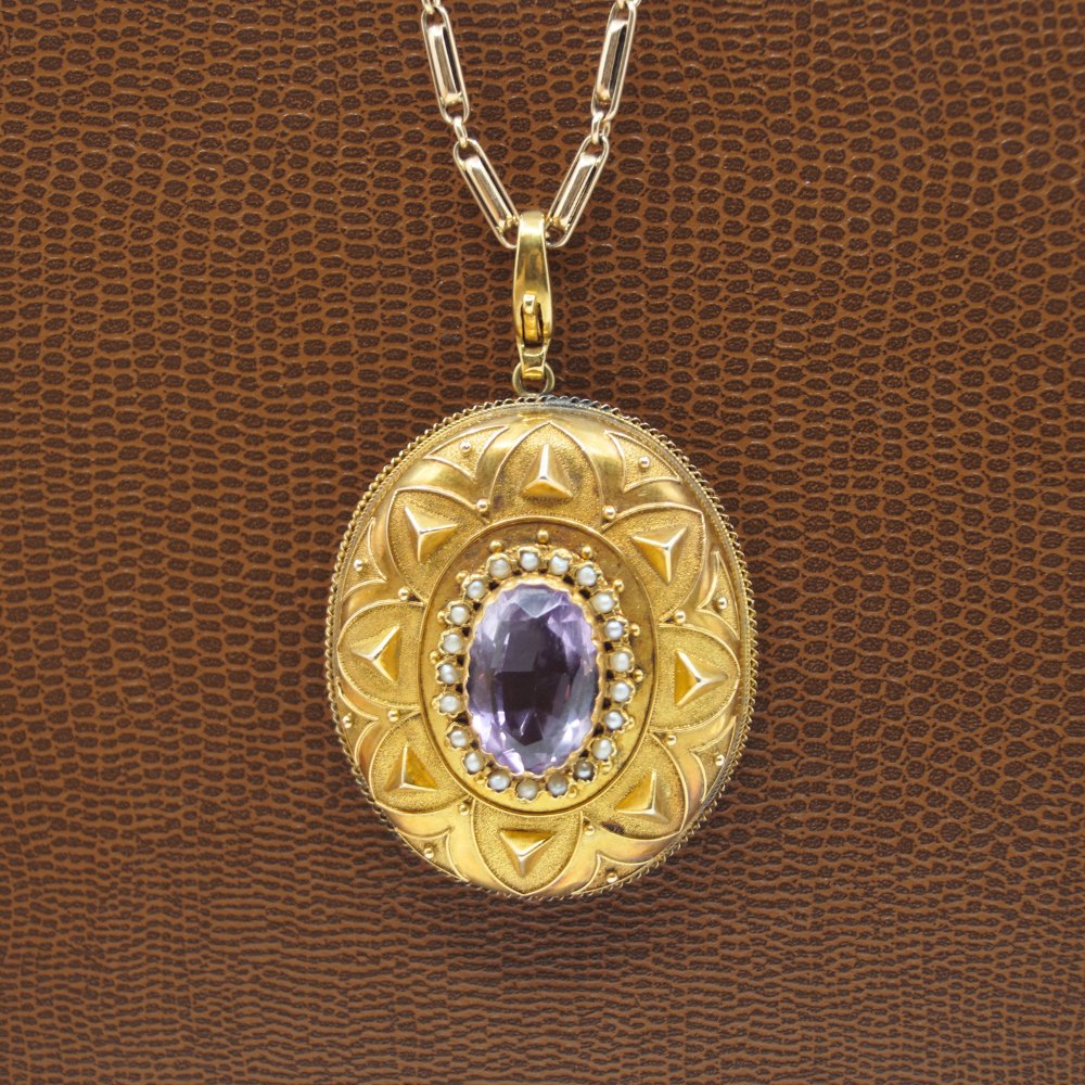 Medallion in 14 kt. gold with amethyst, surrounded by small pearls. Can be opened at the back.Around year 1900. L. 4.5 cm. W. 3.8 cm.