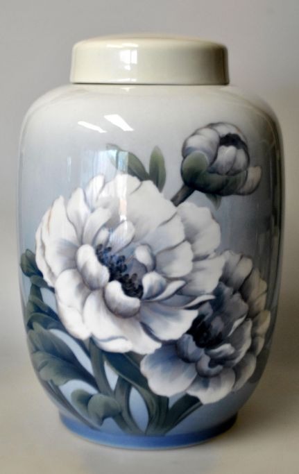 Porcelain lidded jar, Royal Copenhagen no. 92/888, 20th century. Copenhagen, Denmark. Decorated with peonies. Stamped. H: 25 cm. Dia: 17 cm.Item number: 29082