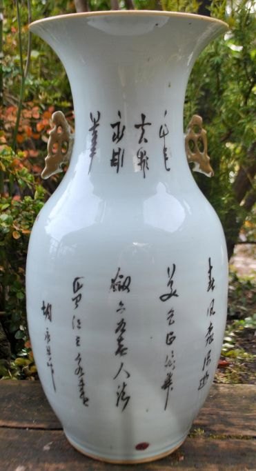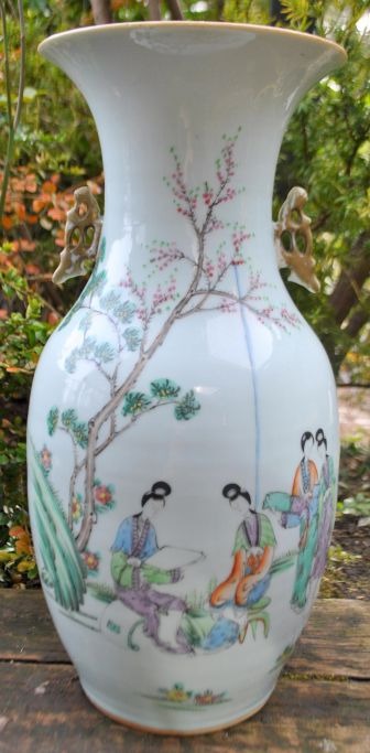 Chinese famille vert baluster-shaped floor vase, 19th century. Polychrome decorated with women in a garden, With text. Stamped. H.: 42.5 cm.Item number: 29083