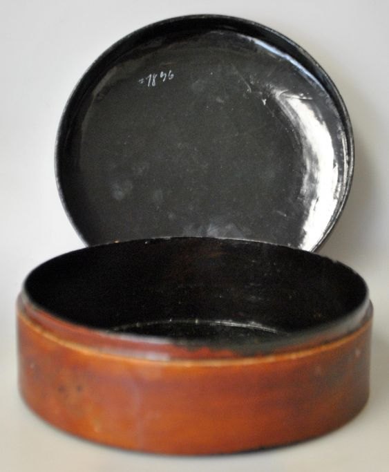 Chinese wooden box with gold paint, 19th century. Decorated with birds and landscape. H: 7 cm. Dia: 17 cm.Item number: 29086