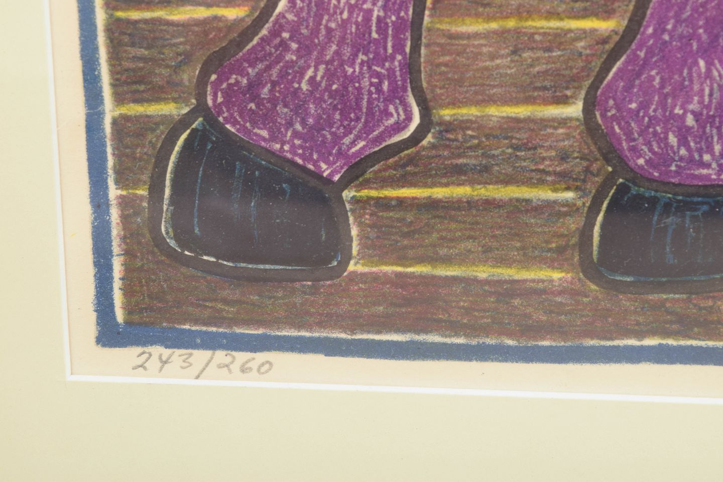 Henry Heerup, colour lithograph, listed Danish artist.Colourful graphic composition with a figurative motif of a man driving a horse cart, executed as a colour lithograph in the artist’s distinctive naïve and symbol-rich style, signed in pencil and numbered 243/260.