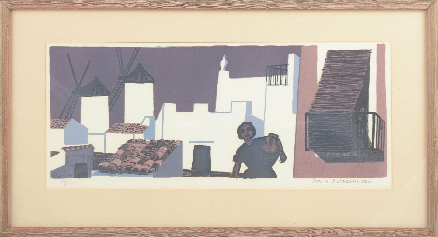 Lars Norman was a Swedish painter and graphic artist active during the second half of the twentieth century. He worked in both painting and printmaking, particularly lithography, producing stylised and decorative compositions featuring architectural motifs, figures, and clear colour planes. His lithographs were commonly issued in signed and numbered editions and circulated through Scandinavian galleries and art societies during the 1960s and 1970s.