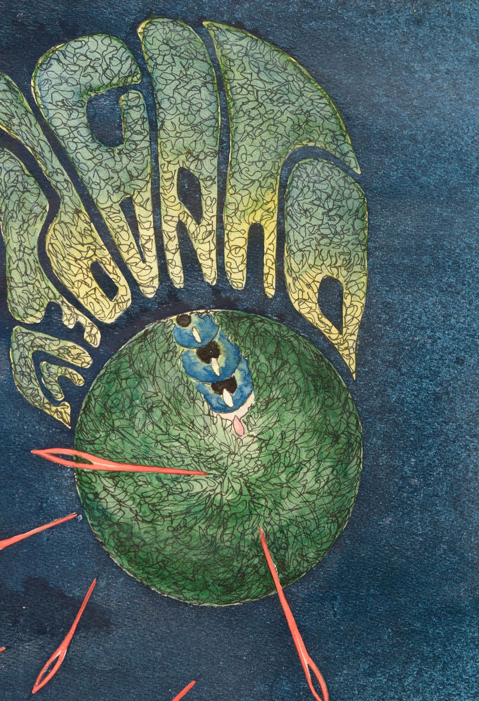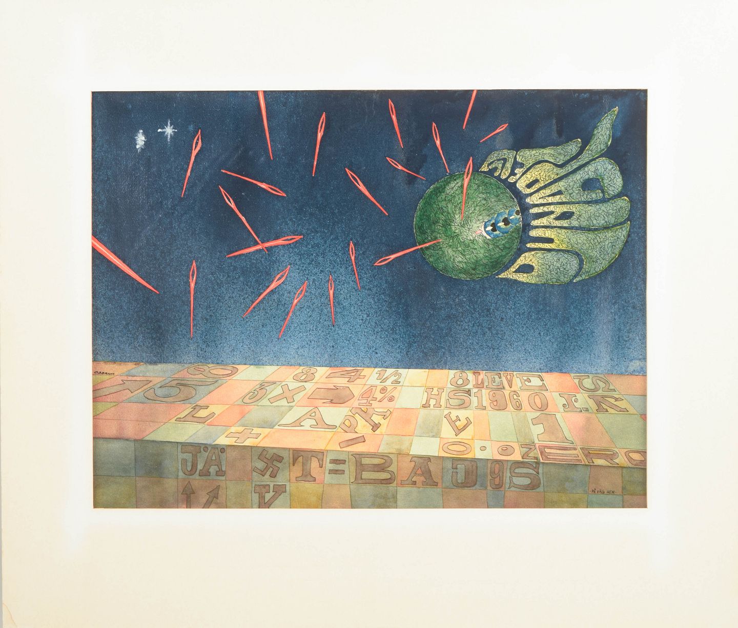 Håkan Stenberg, mixed media, listed Swedish visual artist.Surrealist composition with symbolic and dreamlike elements. The motif depicts an abstract spatial scene with a green spherical form and stylised wing-like shapes surrounded by red linear elements against a deep blue background, above a geometric field filled with numbers and signs.