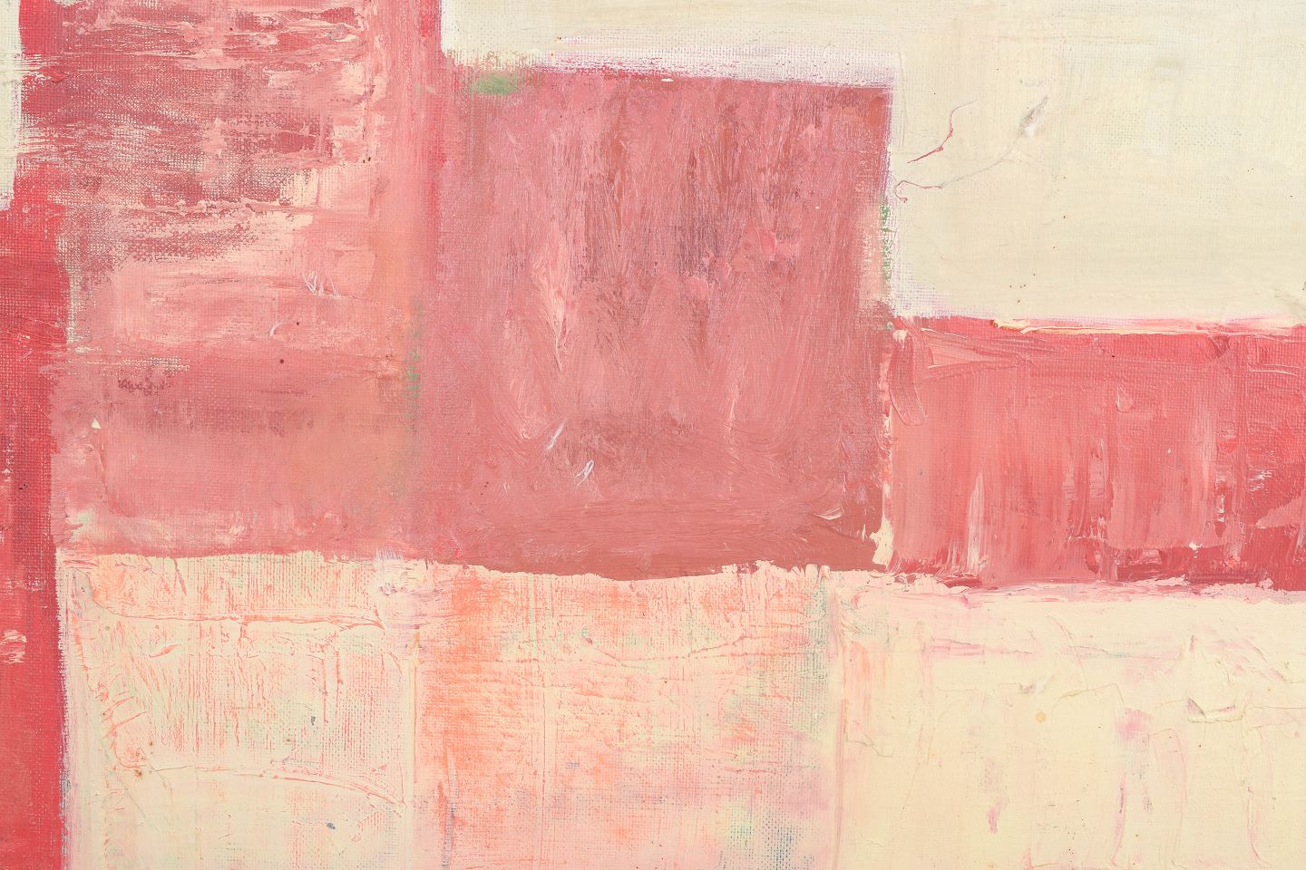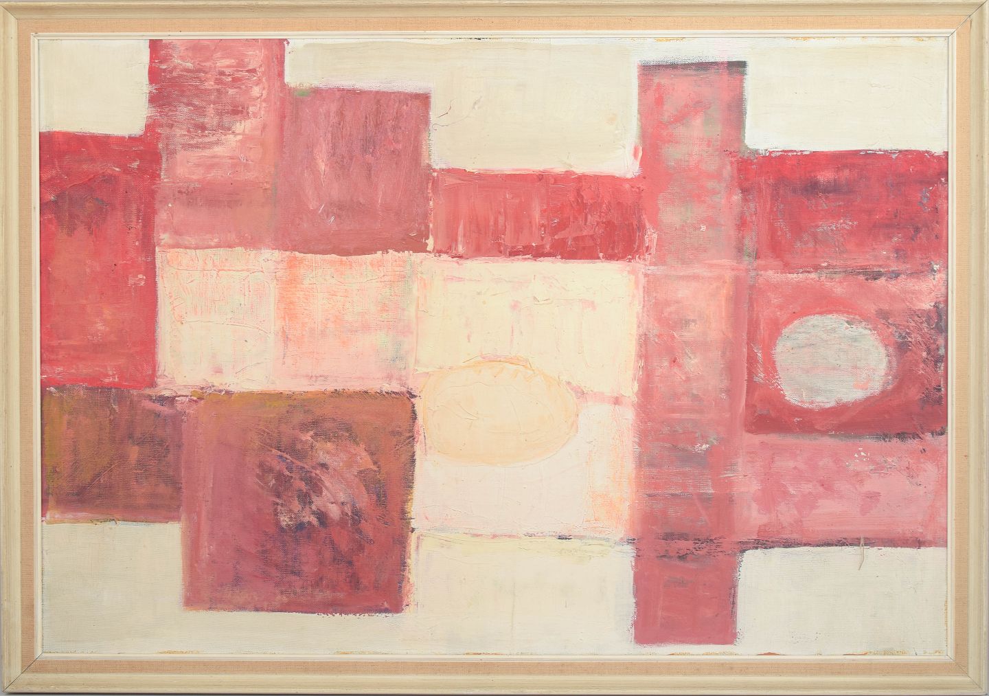Abstract composition executed in oil on canvas with geometric and architectural forms in warm red and pink tones, signed JVR and dated 1966.