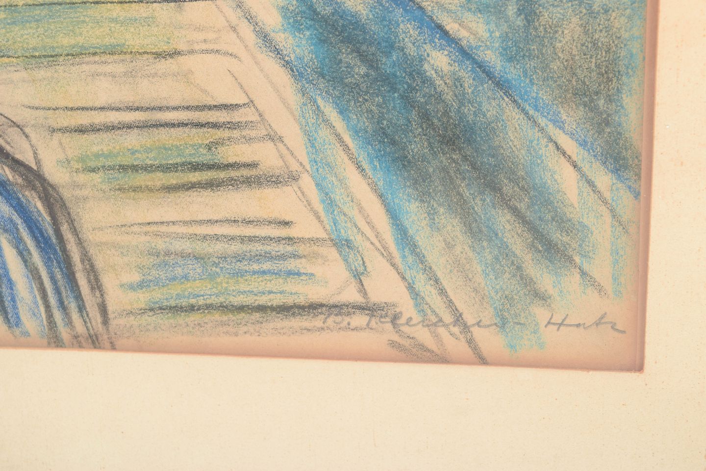 Brita af Klercker, crayon on paper, listed Swedish visual artist.Expressive composition with figures and architectural elements executed in crayon on paper, signed B. Klercker lower right. The work presents a stylised urban scene with people and structures rendered in a loose modernist manner and a light, atmospheric colour palette.