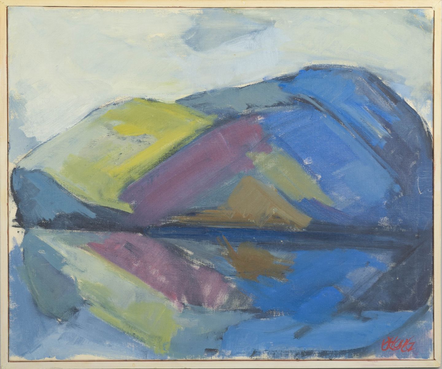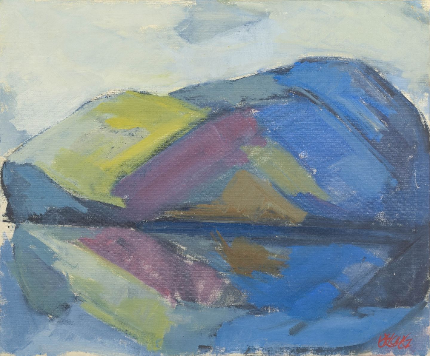 Stig Delang, oil painting on canvas, listed Swedish artist.Modernist northern landscape with stylised forms and reflections across a water surface, executed with broad brushwork and muted tones of blue, green and violet. Signed.