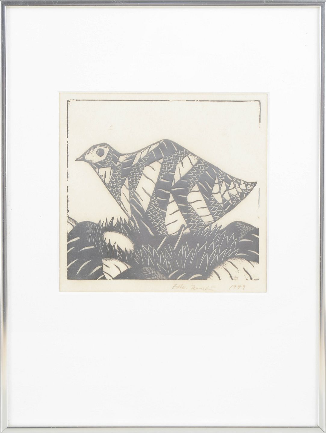 Peter Zennström, woodcut, listed Swedish artist.Graphic composition depicting a stylised bird executed as a woodcut with strong black-and-white contrast and decorative organic patterning in the plumage. Signed in pencil and dated 1979.