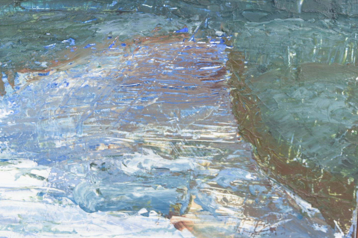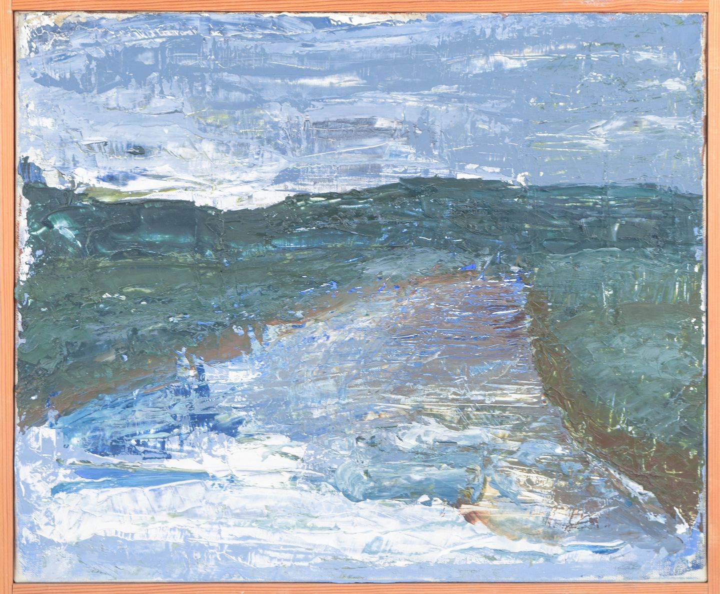 Scandinavian artist, oil on canvas.Expressive landscape composition executed with thick impasto brushstrokes and broad colour areas in blue, green and earthy tones. The composition suggests an open landscape with a stream or path, rendered in a free painterly manner typical of Scandinavian modernism of the 1970s. Unsigned.