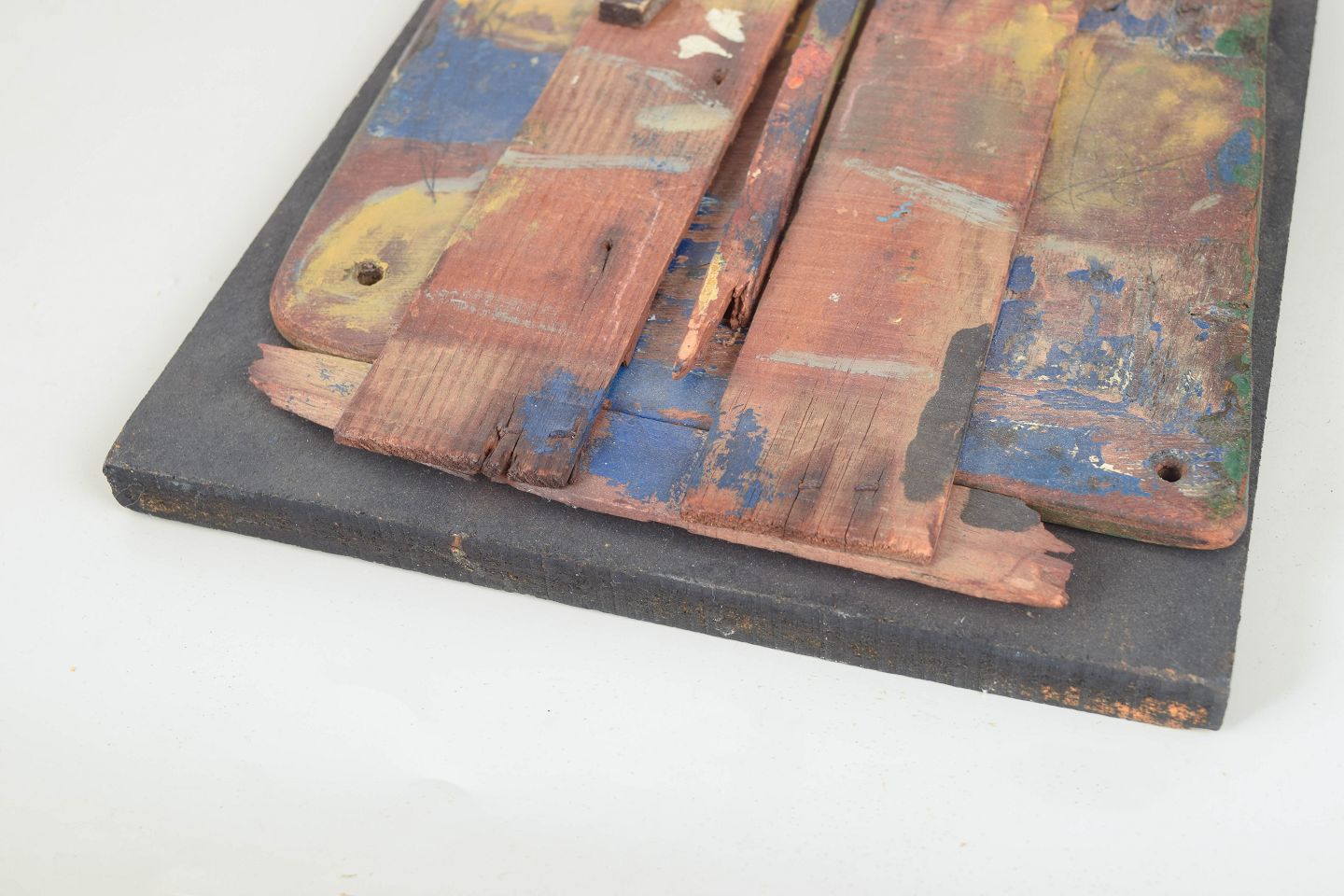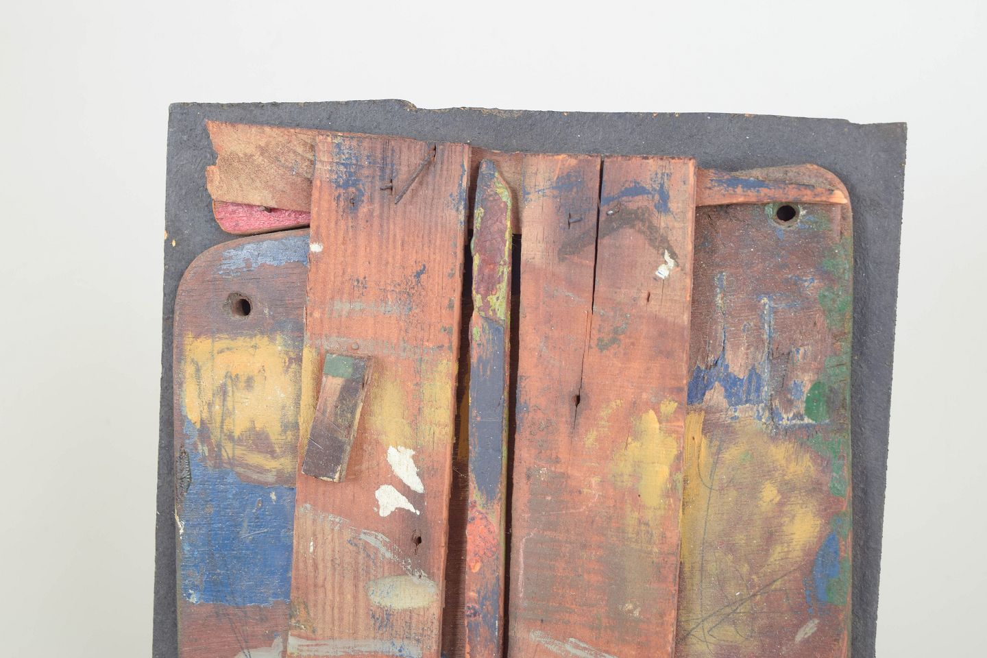 Johan Andersen, wood relief.Wall relief executed as a collage of different woods arranged in geometric sections with varied tones and natural grain patterns. The composition uses contrasts between dark and light woods, creating a graphic relief motif typical of Scandinavian decorative wall art from the mid-twentieth century. Unsigned.
