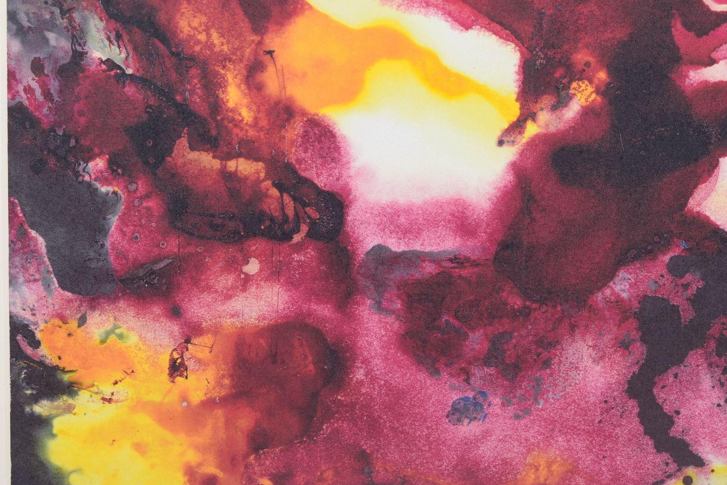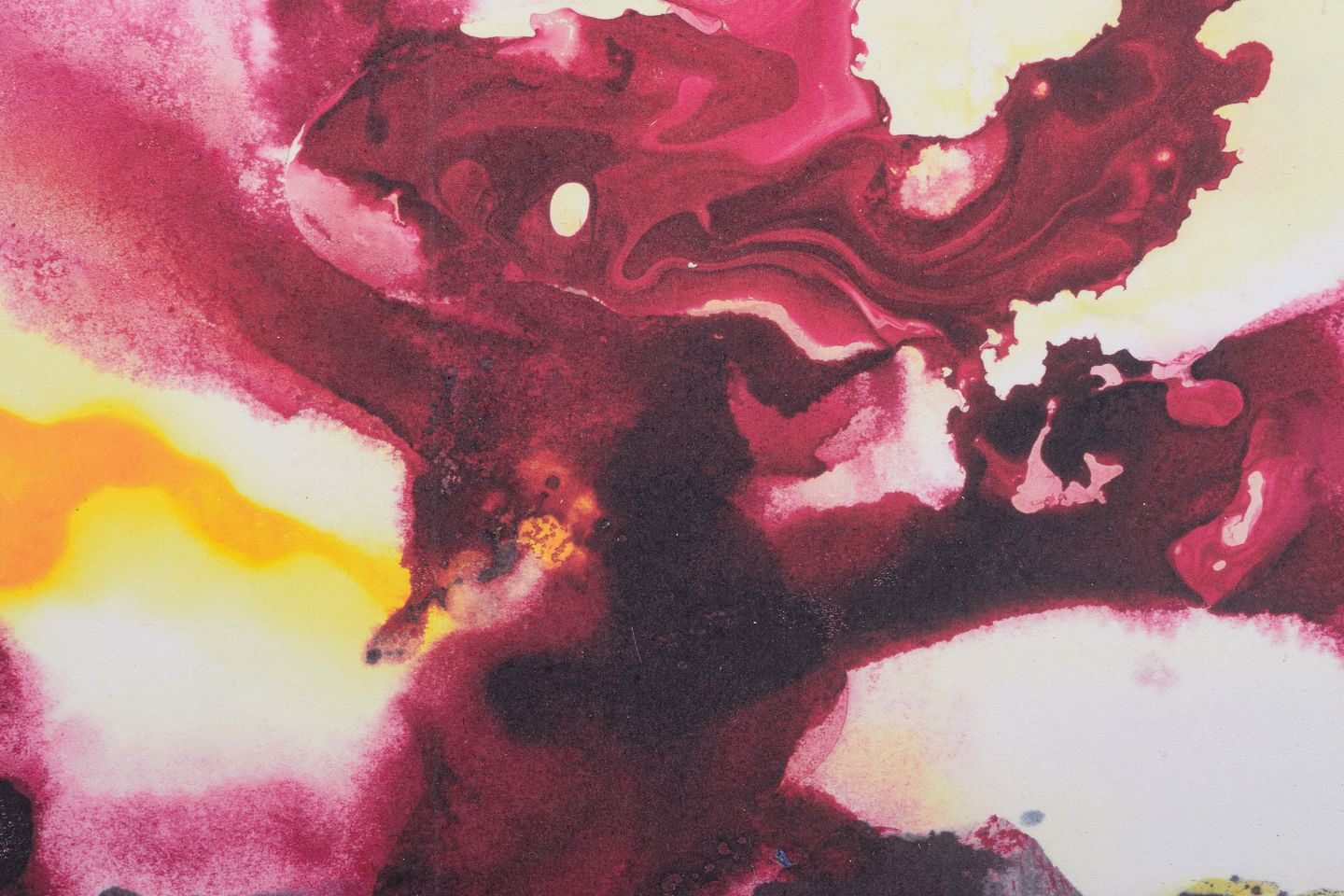 Gerhard Richter, colour print, well listed German artist.Abstract composition executed as a colour print with powerful colour fields in red, pink, yellow and dark tones. The motif appears dynamic and organic with fluid transitions and translucent layers, creating an intense and expressive visual character.
