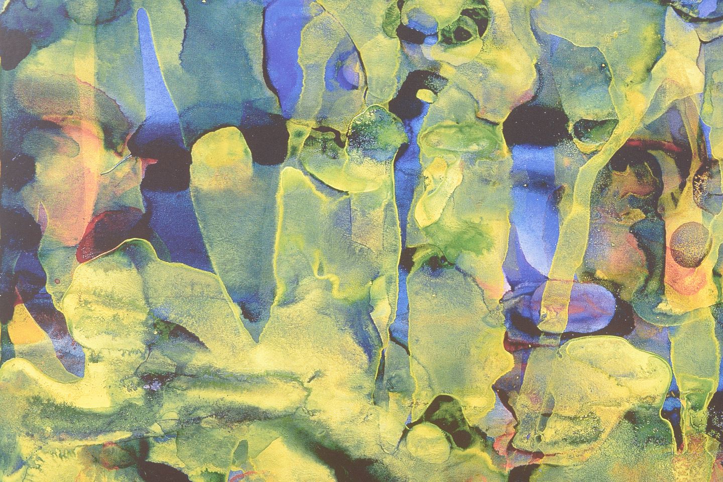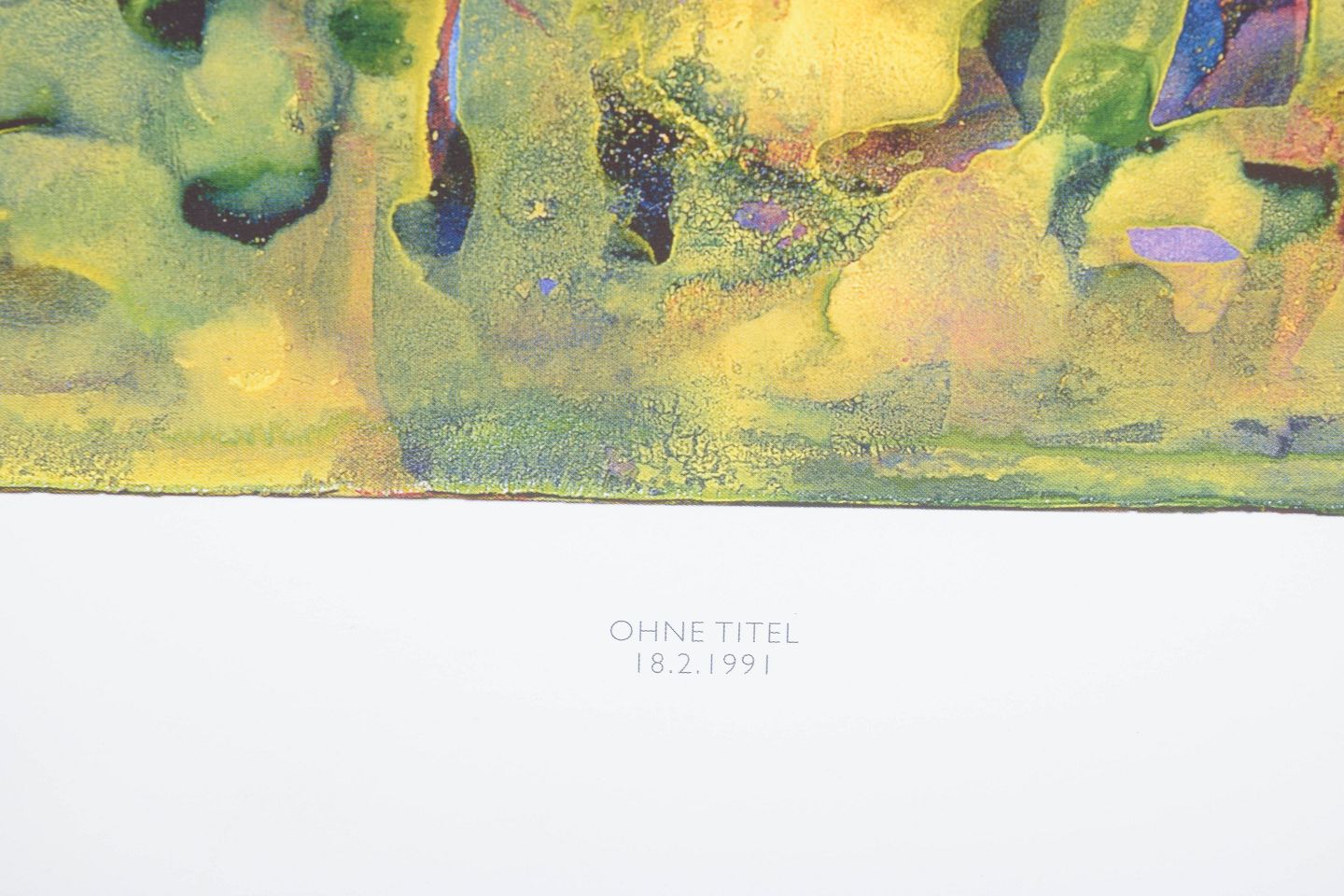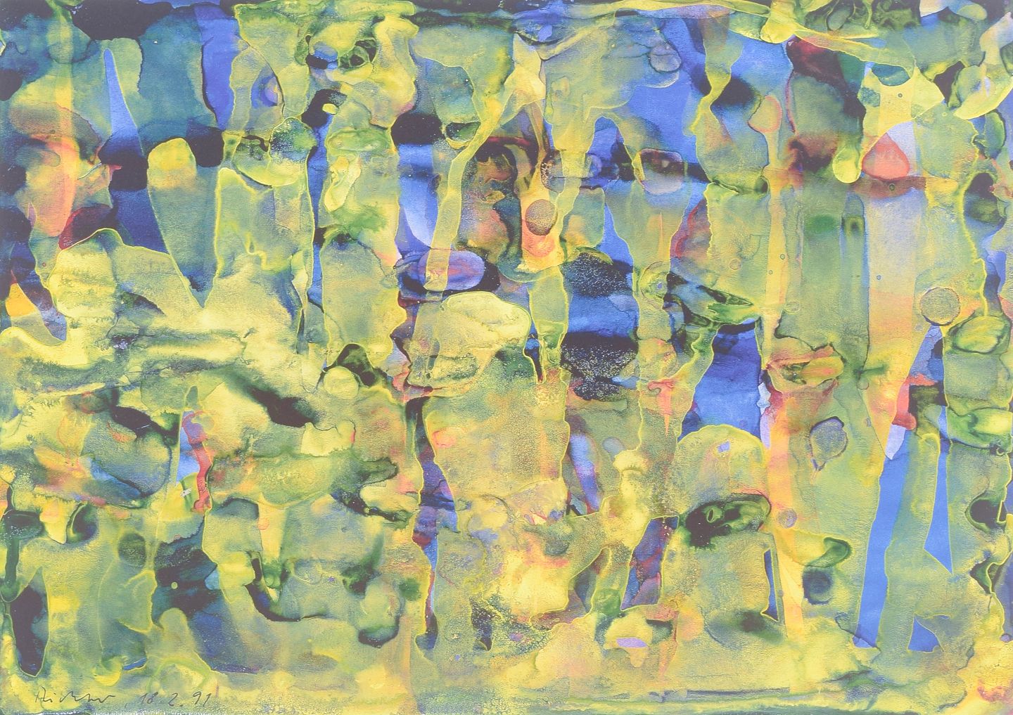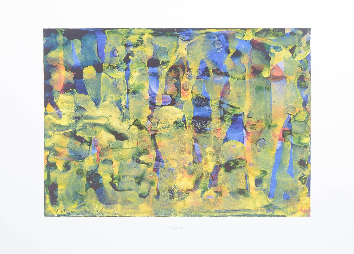Gerhard Richter, colour print, listed German artist.Abstract composition executed as a colour print with fluid organic forms in layered tones of green, blue, yellow and violet. The motif displays a dissolved structure with vertical traces and translucent colour fields. Signed in the print and dated 1991.