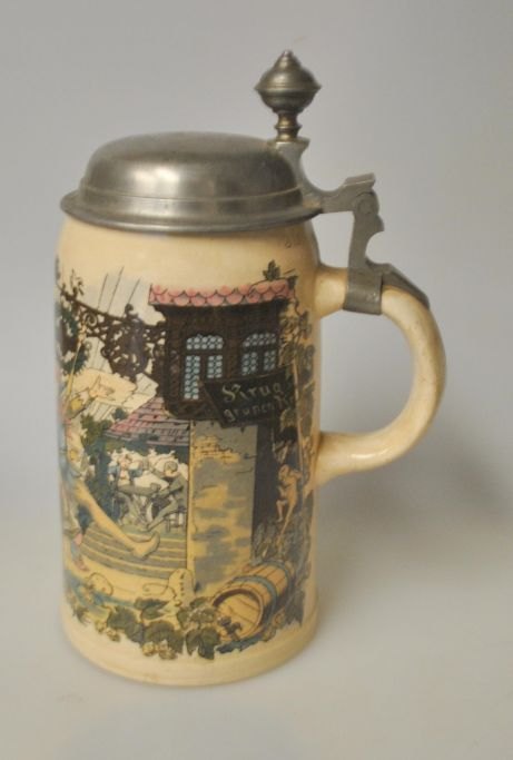German faience mug with pewter lid 1909. Decoration in transfer technique with procession. H.: 21.5 cm.Perfect condition!