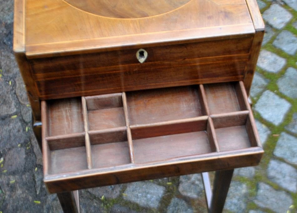 Empire sewing table, 19th century. Denmark. With intarsia. With openable and lockable top, under which there is a smaller compartment. Another drawer with compartment. On tapered legs. H.: 75 cm. W.: 30 cm. D.: 30 cm.Great condition!