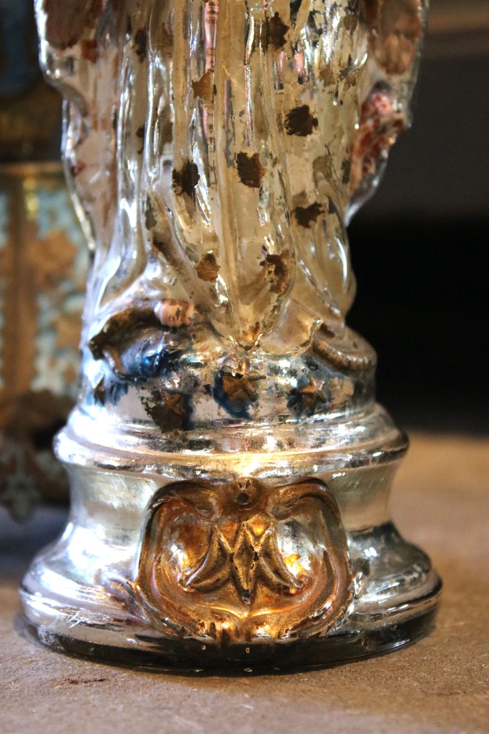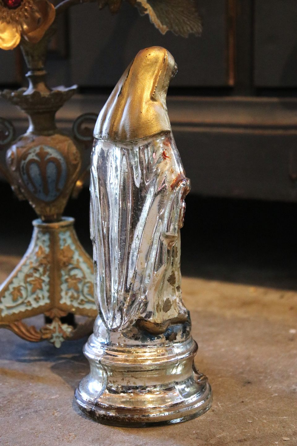 Antique 19th century Madonna figurine in poor man's silver / Mercury glass with fine old painting. Height: 21.5cm.Item number: Madonna nr.3