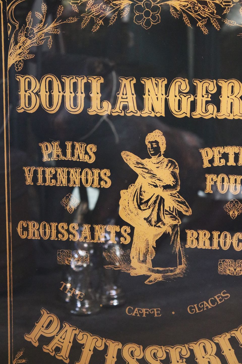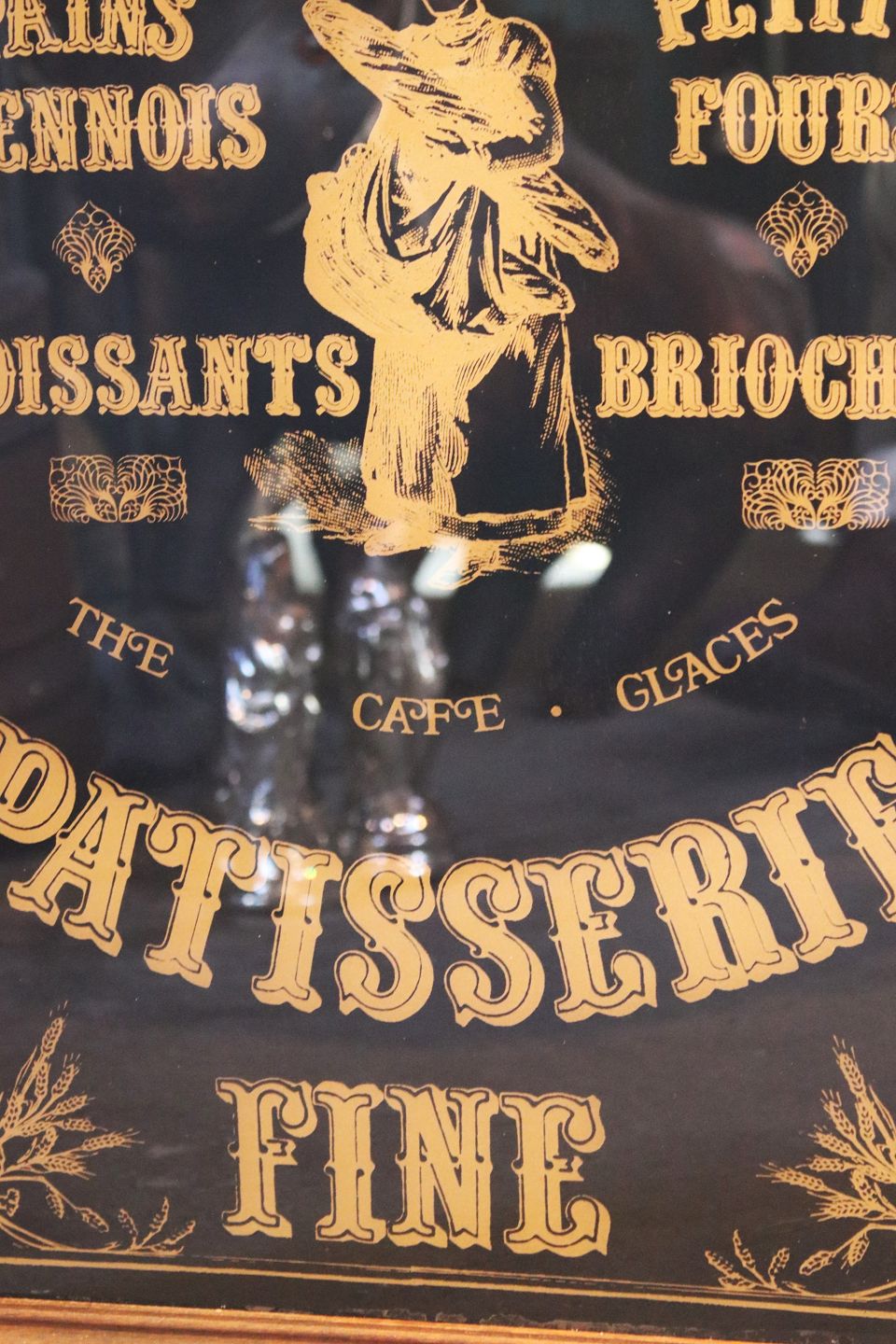 Advertising sign from an old French pastry shop / baker, painted on glass (Back) "Boulagerie / Patisserie Fine" in black and gold. The sign is framed in an old wooden frame and measures: 63x43cm. Dealer