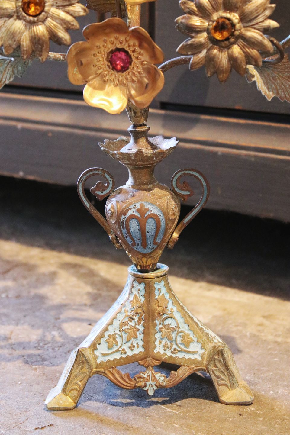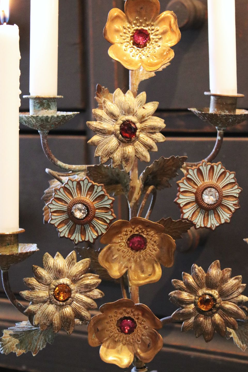 Antique, French church candlestick with space for 5 candles and decorated with 8 fine metal flowers with colored stones.H: 55cm. W: 28cm.