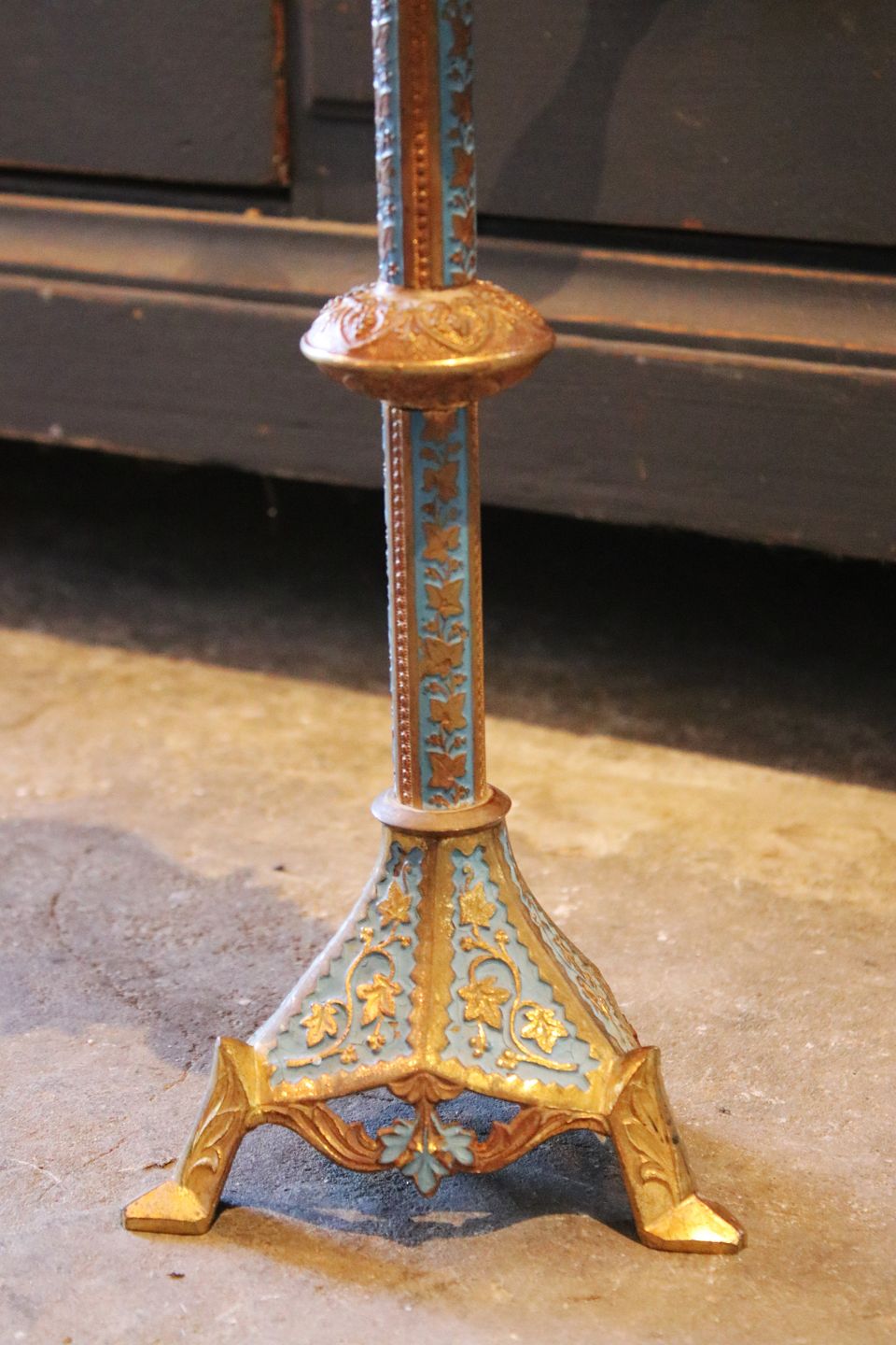 Old French church candlestick for a block candle in brass with turquoise blue paint. H: 35cm. Dealer