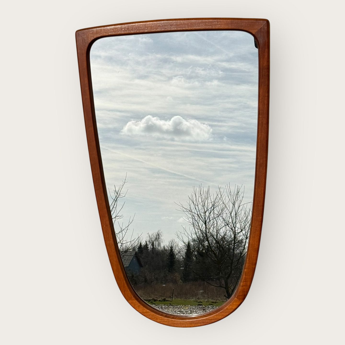 Mirror in a teak frame with a beautiful shape, Danish modern from the 1960s, Good condition, Dimensions: 75x46cm *Good condition*Stock: 1