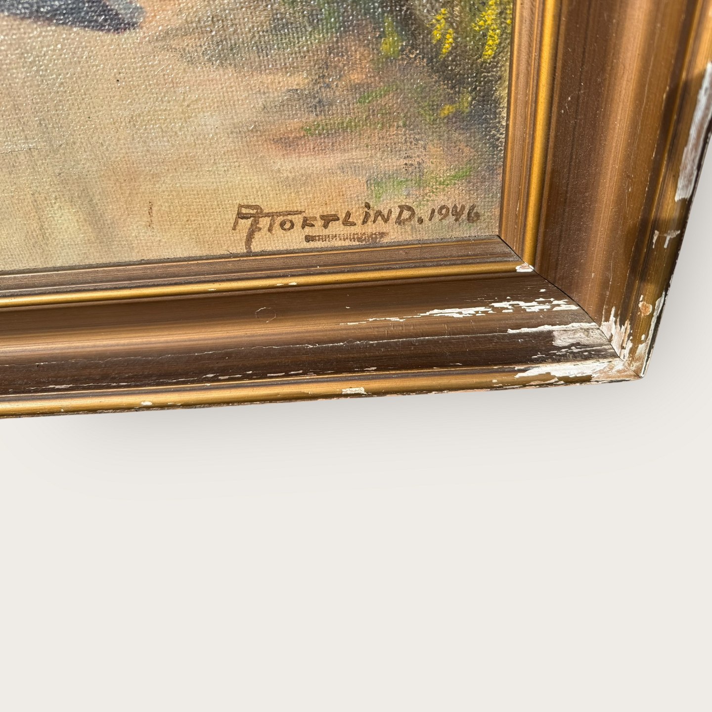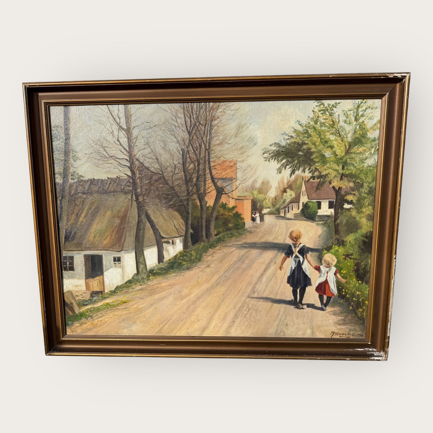 A. Toftlind, Girls on a road, oil painting on canvas, some peeling on the picture frame, otherwise good condition, Dimensions with frame: 110x85cmStock: 1