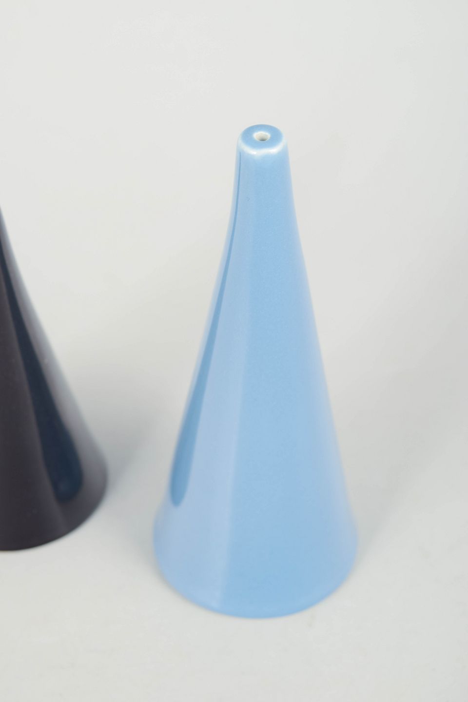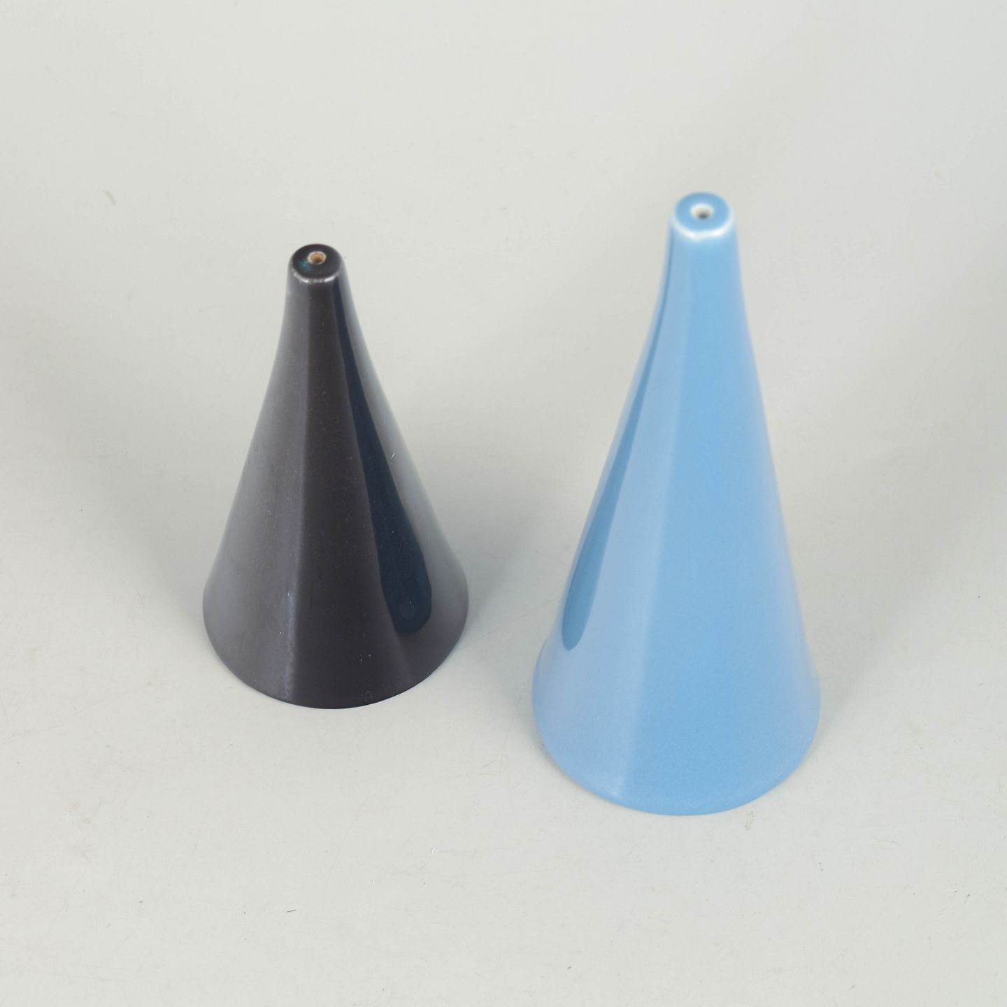 Stig Lindberg for Gustavsberg, salt and pepper set.Handmade set in glazed stoneware with conical forms in light blue and dark glaze. Clean, sculptural shapes with a distinct modernist expression. Model Colorado.