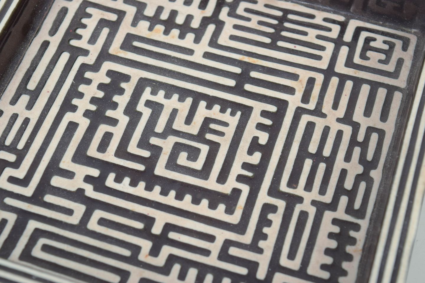 Stig Lindberg for Gustavsberg, Domino dish.Square stoneware dish decorated with the characteristic Domino pattern in black on a light ground, featuring a graphic labyrinth-like ornamentation. Model Domino.