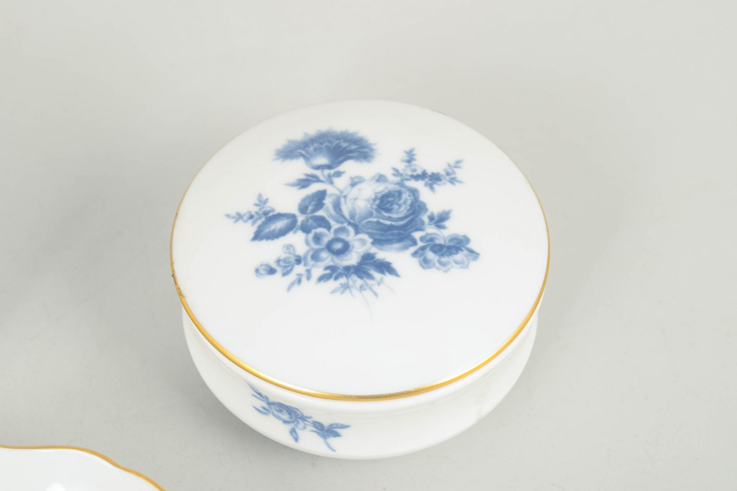 Meissen Aquatinta, set of two lidded jars and one dish.Two lidded jars and a small dish decorated with floral and insect motifs in blue tones with gilt rims. Model Aquatinta. Marked with Meissen crossed swords, first factory quality.