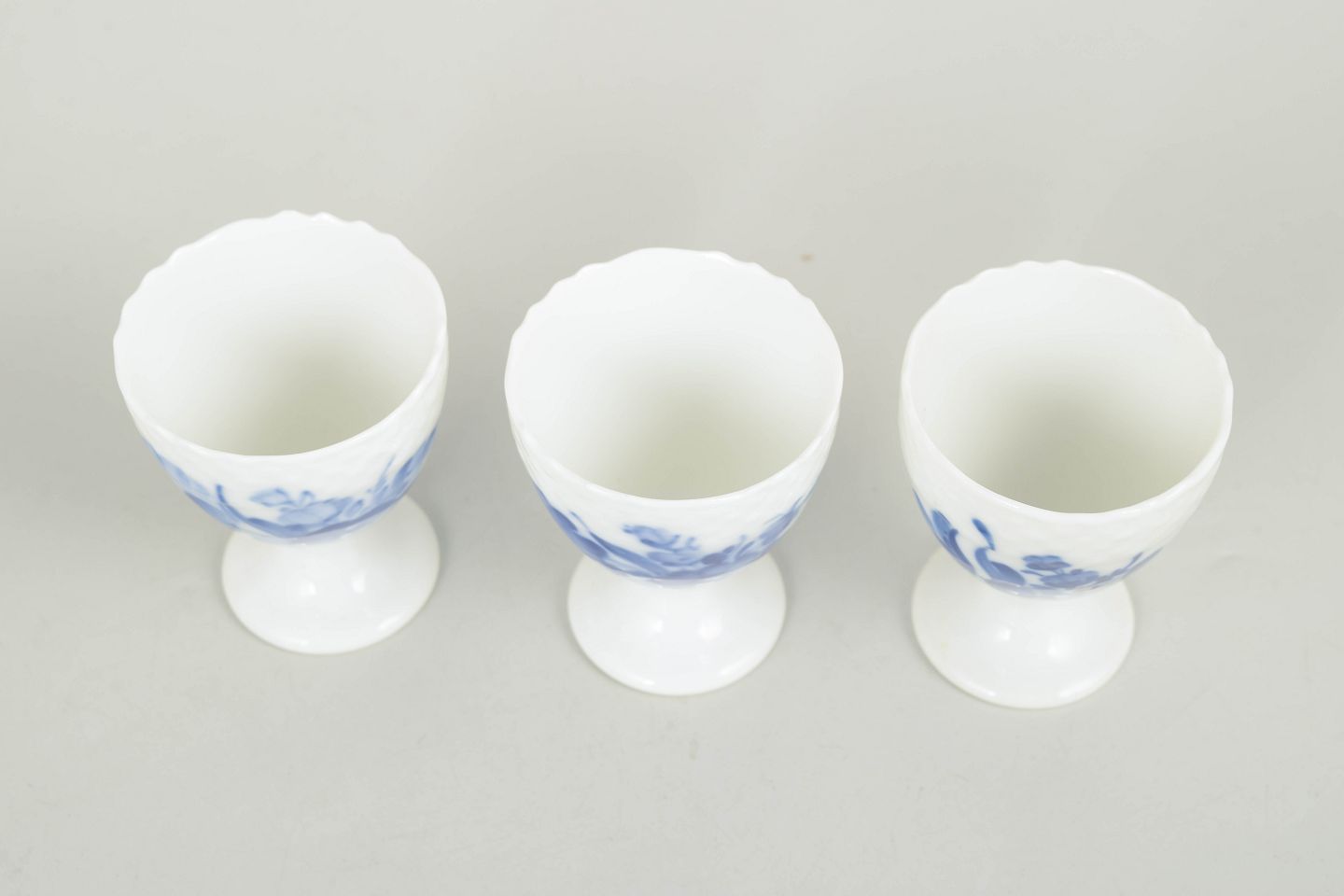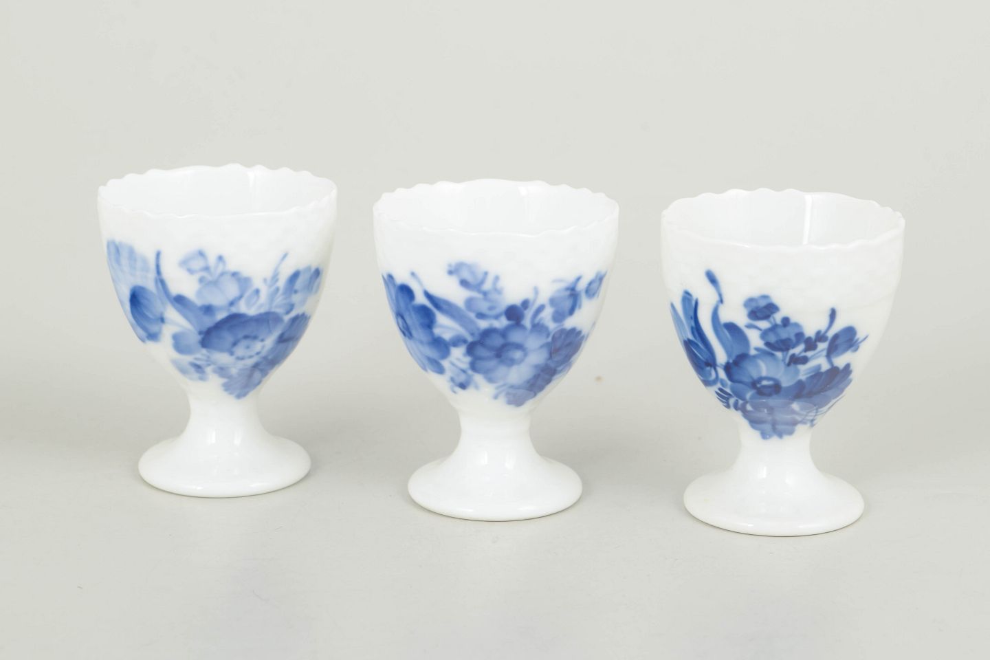 Royal Copenhagen, Blue Flower Curved set of three egg cups.Set of three porcelain egg cups decorated with hand-painted blue floral motif in relief. Model number 10/1568, 1st factory quality, early 20th century.