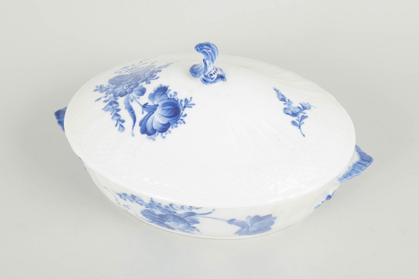 Royal Copenhagen, Blue Flower Curved oval lidded tureen.Oval porcelain tureen with lid and side handles, decorated with hand-painted blue floral motif in relief.