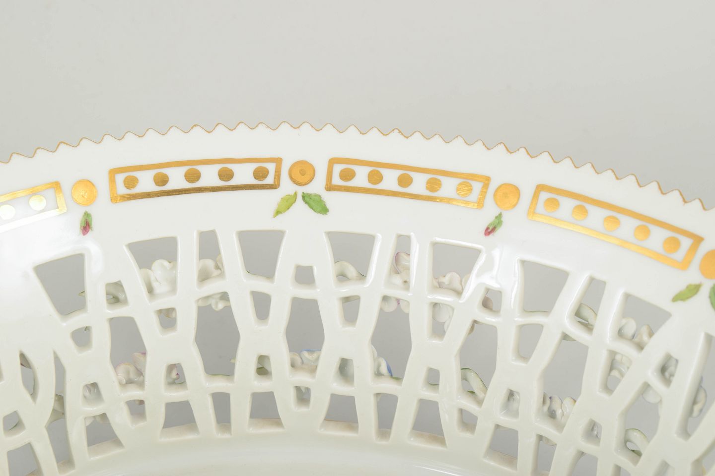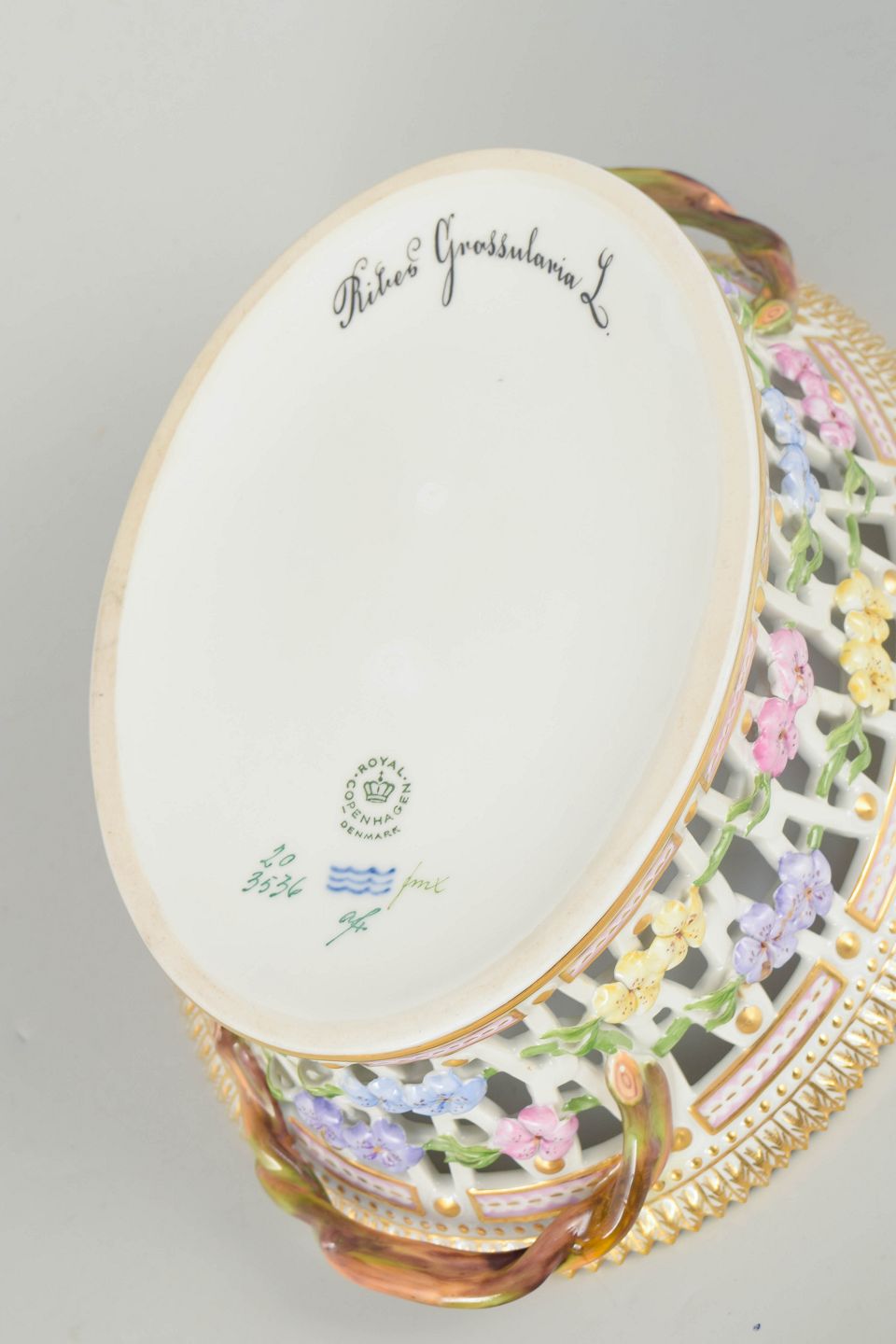 Royal Copenhagen Flora Danica basket.Open reticulated basket with pierced body and hand-painted botanical decoration from the Flora Danica series. Executed in porcelain with fine detailing and gilding. Model 20/3536, 1st factory quality, dated 1964.