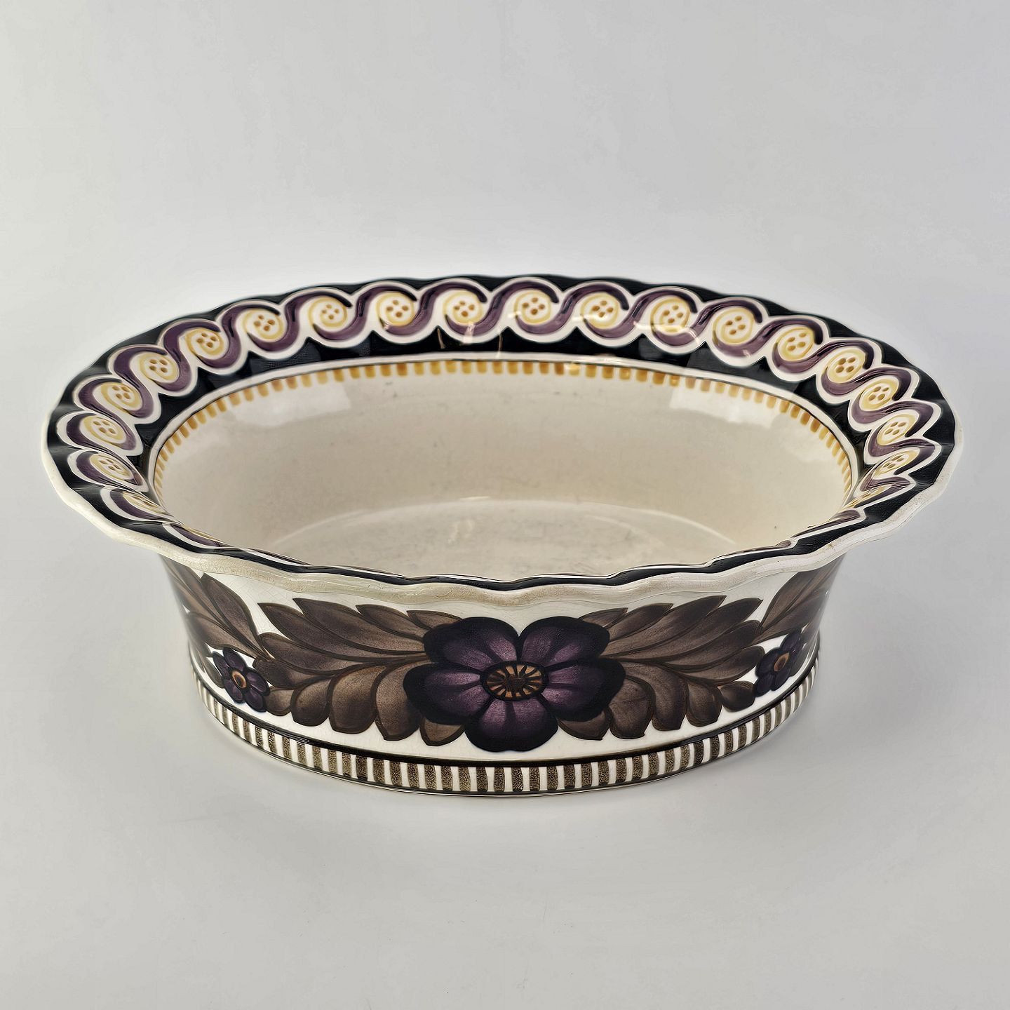 Oval jardiniere i fajance med dekoration af brun og lilla blomsterNr. 863/690