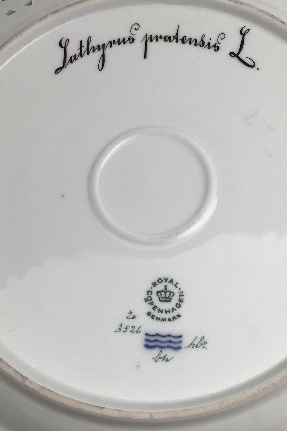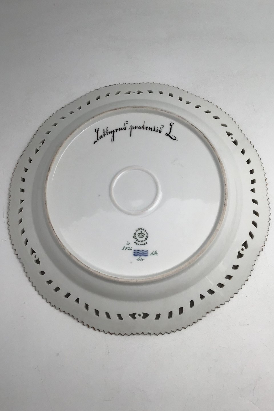 Royal Copenhagen Flora Danica Plate with pierced border No. 20/3526. Measures 27cm / 10.63 inch. 1st Quality Latin name: Lathyrus pratensis L.