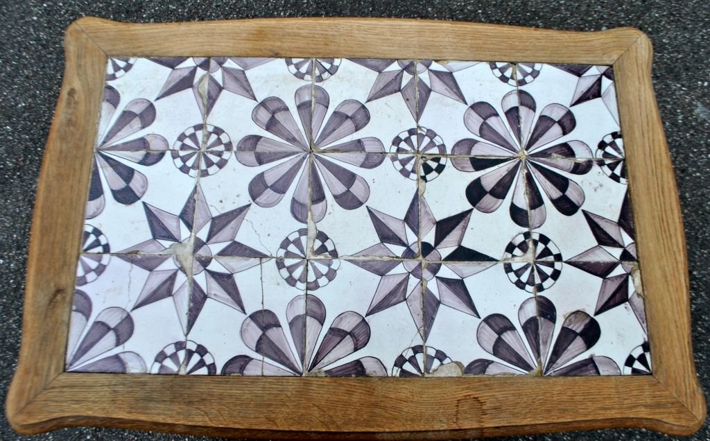 Tile table in oak, baroque style, 20th century. Denmark. H: 60 cm. L: 78 cm. W: 53 cm. 15 original star tiles in manganese from the latter part of the 18th century, Friesland.Item number: 29125