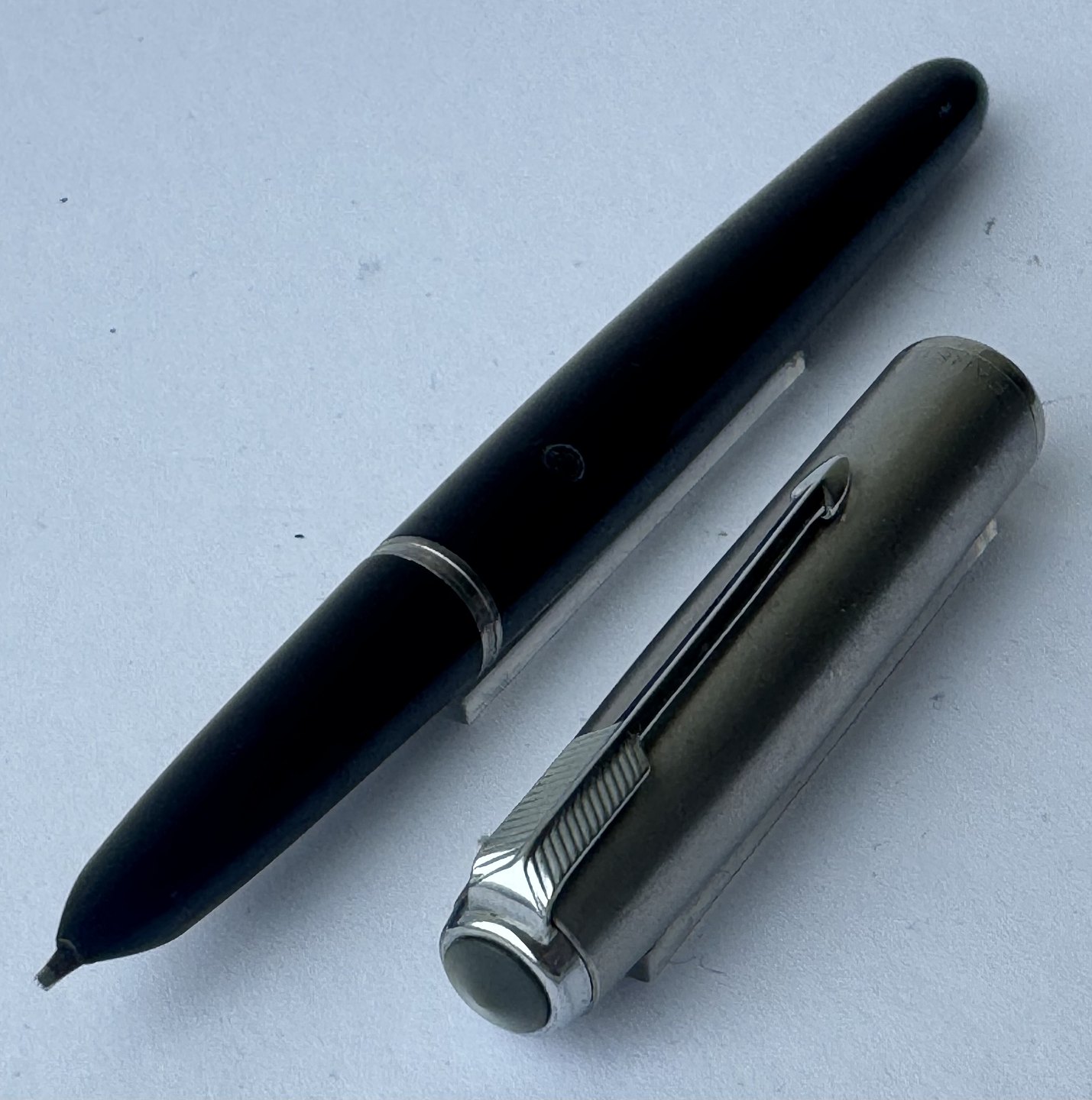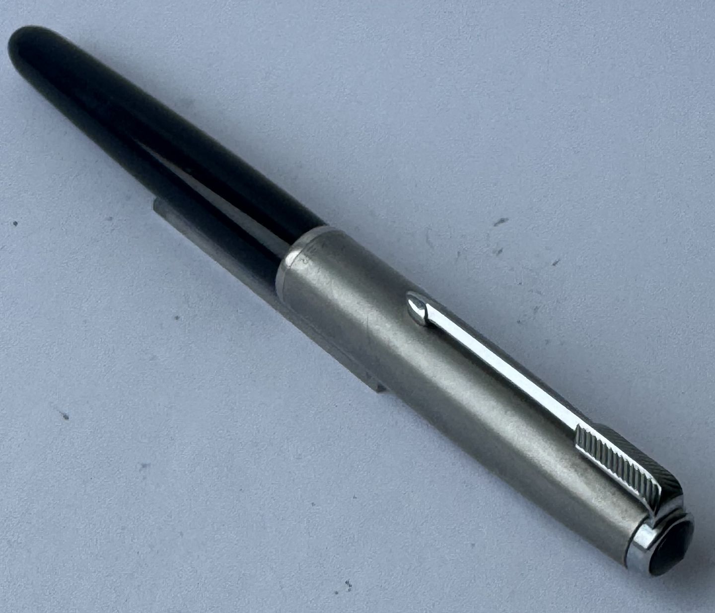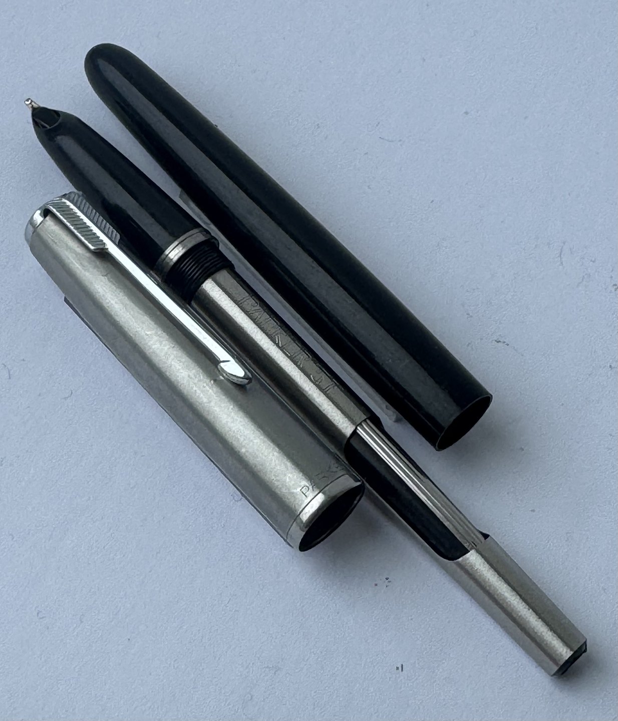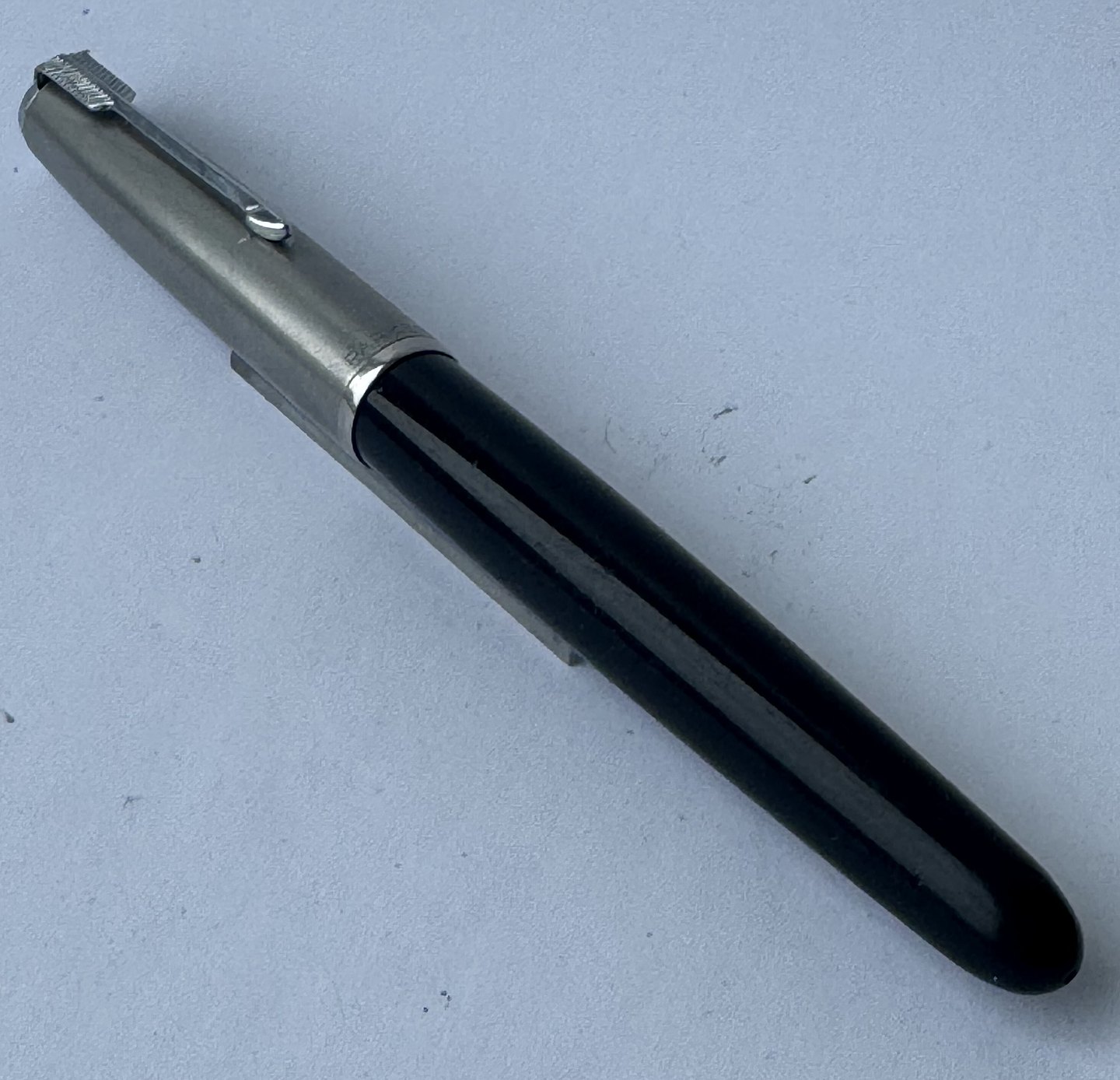Black Parker 51 fountain pen with steel cap from the 1950s. Appears in good and functional condition. No faults or missing parts to describe. On the side you can see “the danish anchor” (small imprint logo), which is the fountain pen manufacturer and retailer Christian Olsen's company logo (an Anchor and initials C. O.). Fountain pens that were imported to Chr. Olsen's factories were stamped with this logo as well as the company's own products, for example Penol. Dealer
