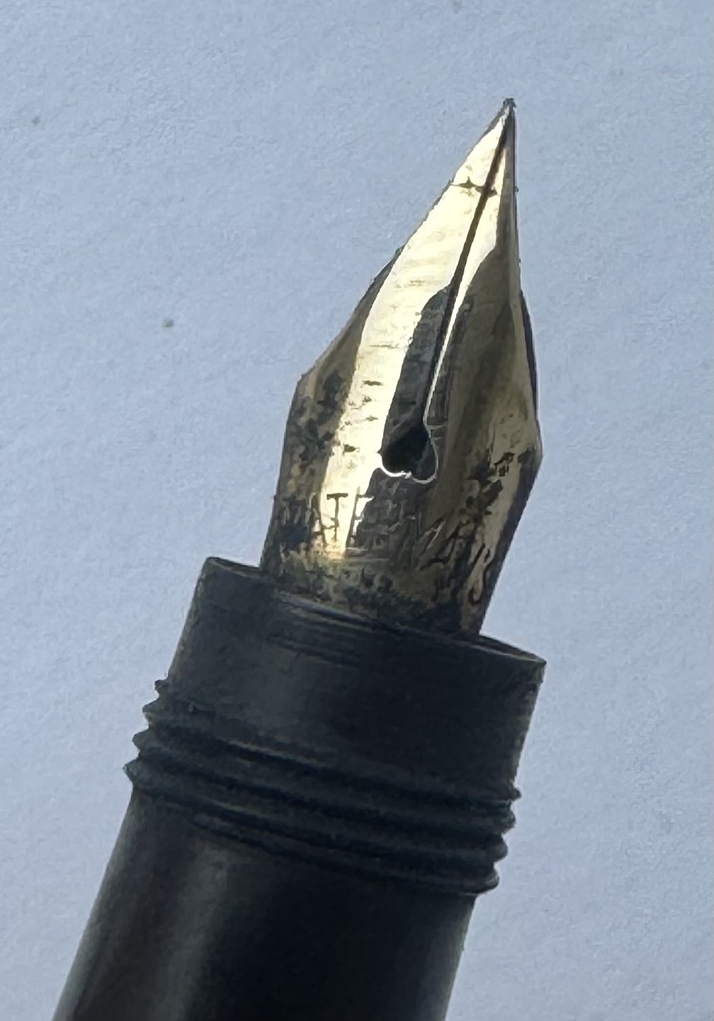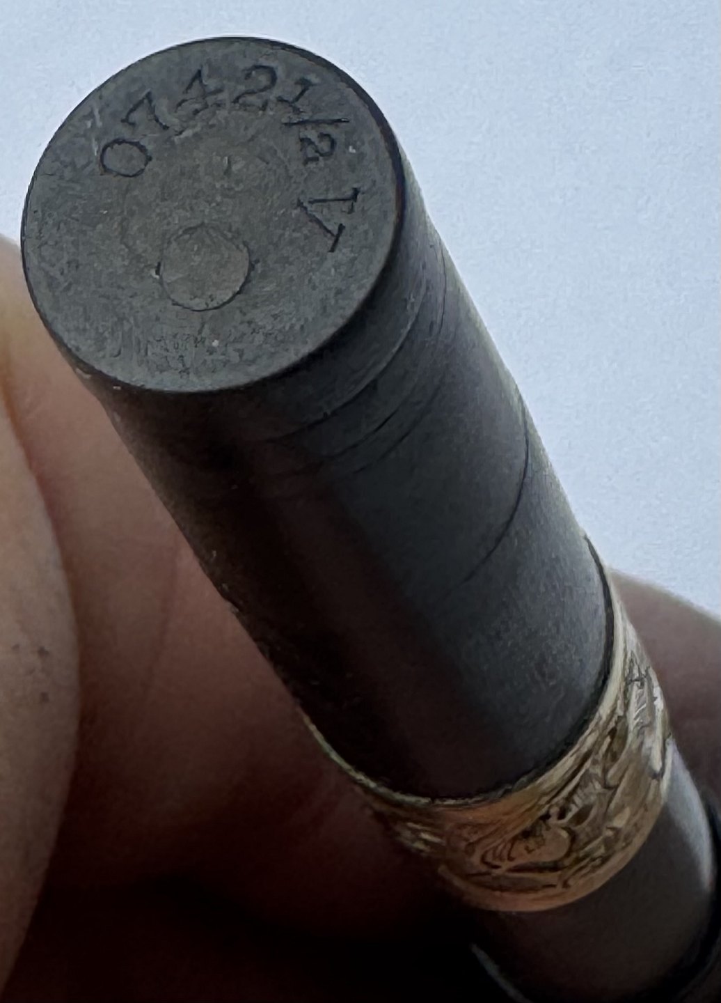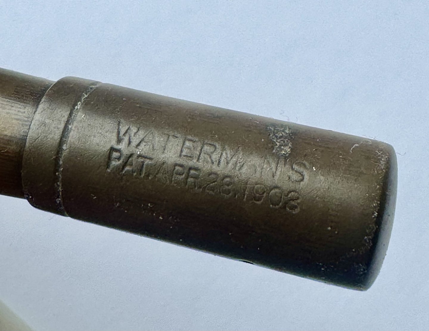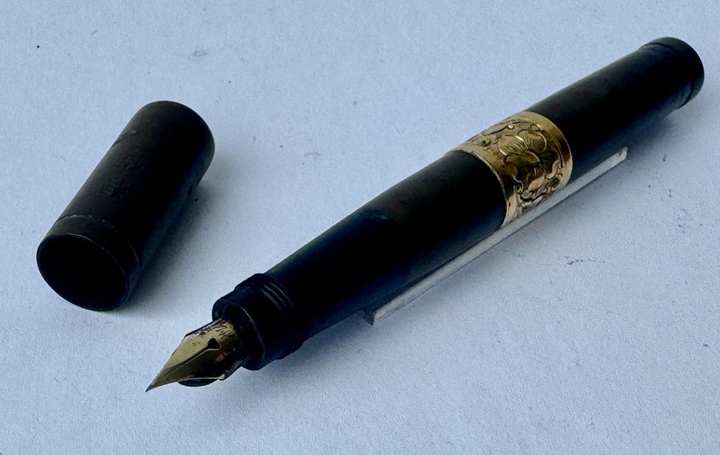 Black Waterman Safety fountain pen from 1903. Model number 42 1/2 V is engraved on the bottom on the pen (see photo). In the middle of the pen is a brass belt decorated with a flower and the owner's initials B. B. The original gold nib moves back and forth when the bottom screw is turned. The cap is engraved WATERMAN'S PAT.APR.28.1903. On the bottom, on the side, you can see faintly engraved WATERMAN and SAFETY. Appears in good condition without damage or repairs. Slight discoloration. Length: 8.7 cm Dealer
