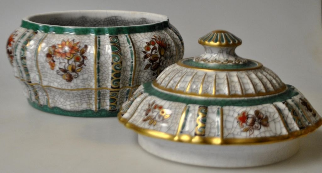 Dahl Jensen lidded jar in craquelle, 241/704, 20th century. Copenhagen, Denmark. Hand-painted floral motifs, greenery and gilding. H: 16 cm. Dia: 19 cm.Item number: 29029