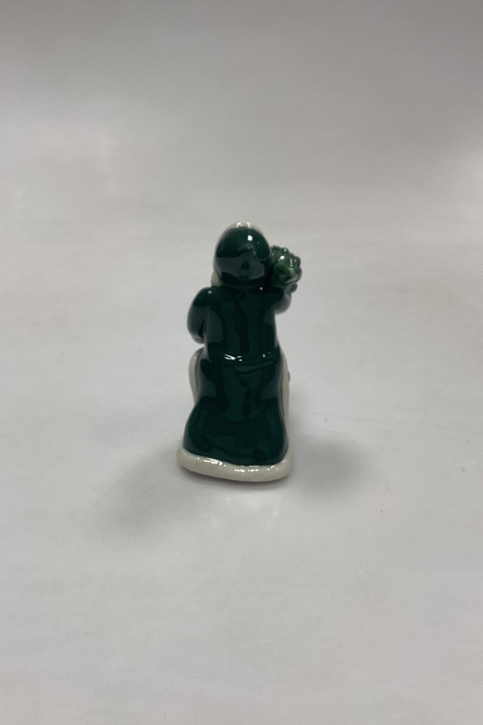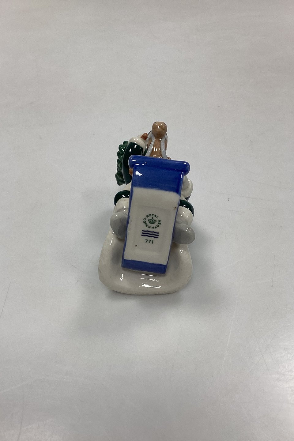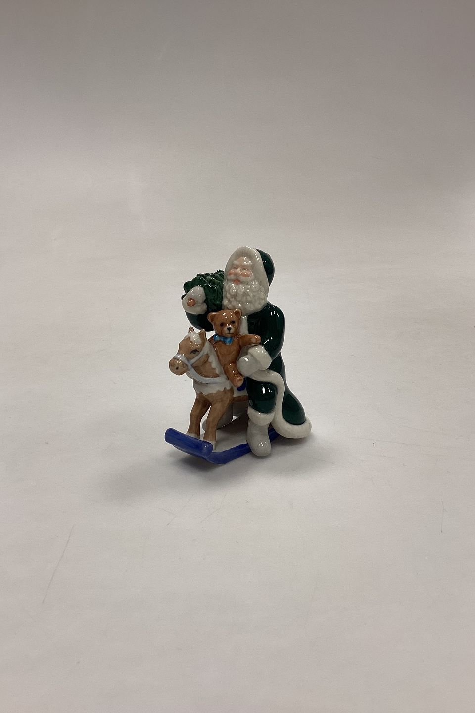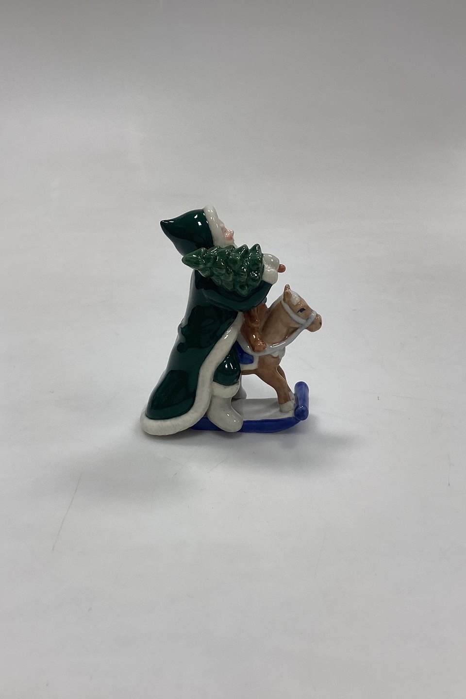 Royal Copenhagen Figurine Santa Claus of the Year 2005 No. 771. Santa Claus in green clothes on a rocking horse. Designed by Sven Vestergaard.Measures 9 cm / 3.54 in.