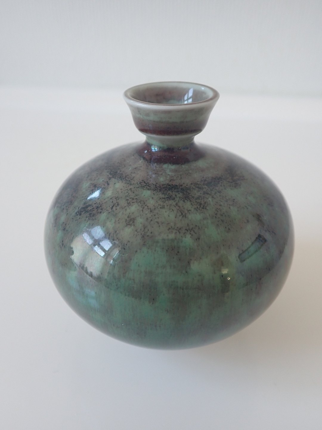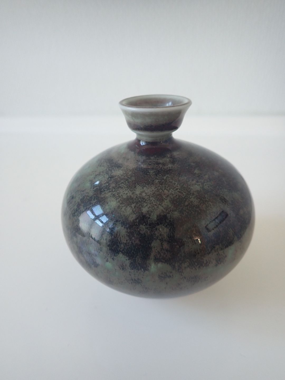 Berndt Friberg (1899 - 1981 )- Lille, buttet vase i stentøj med lille krave med blank grøn/brun/sort spættet glasur. Stemblet Friberg 77, Studio-hånd fra Gustavsberg. Højde: 8,7 cm. Bredde: ca. 7,5 cm. I fin stand. Dealer