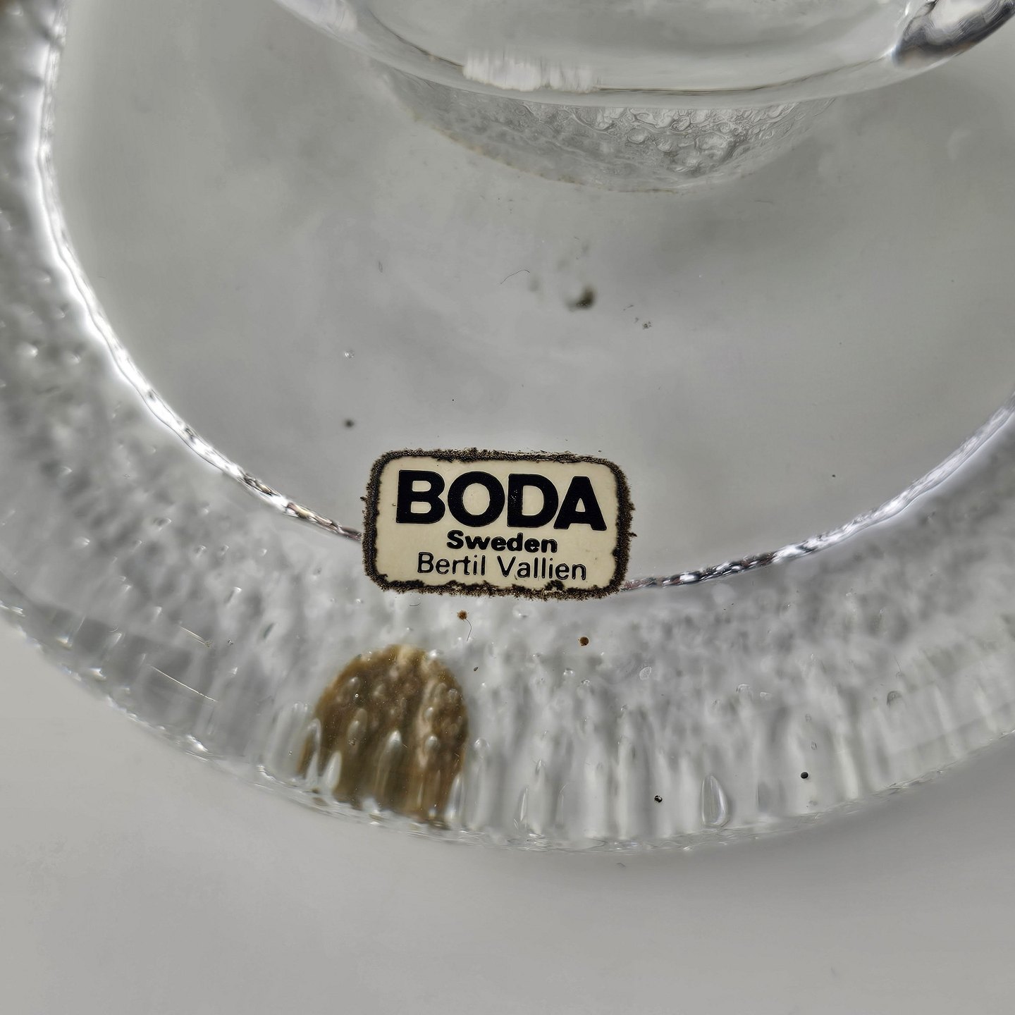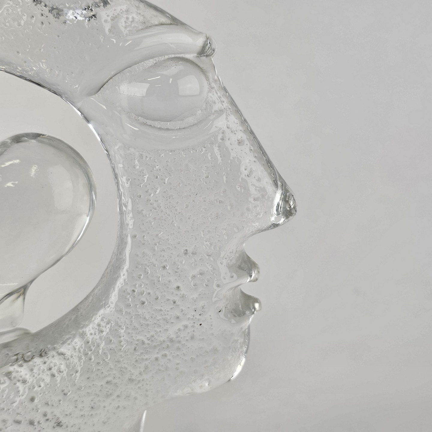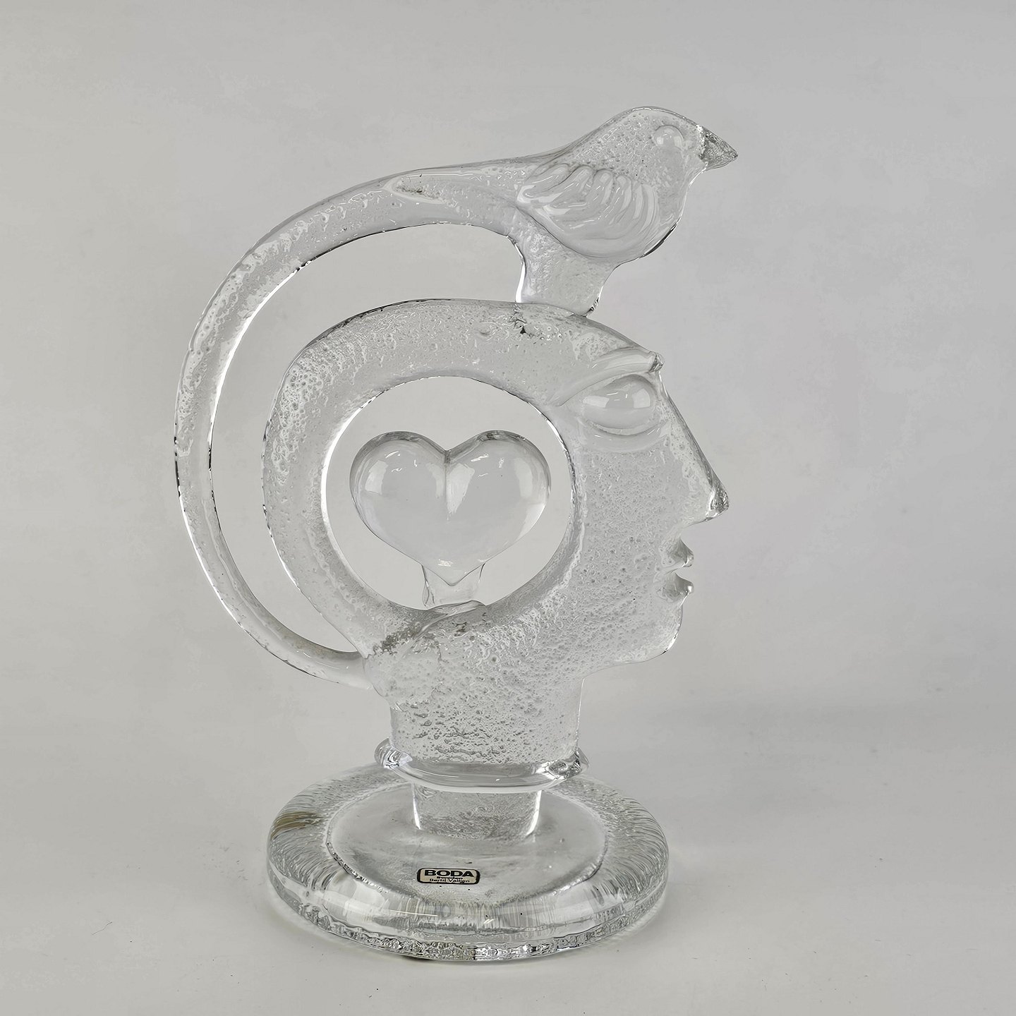 Skulptur i glas med motiv af et menneske i profil, en fugl og et hjerteFormgiver Bertil Vallien