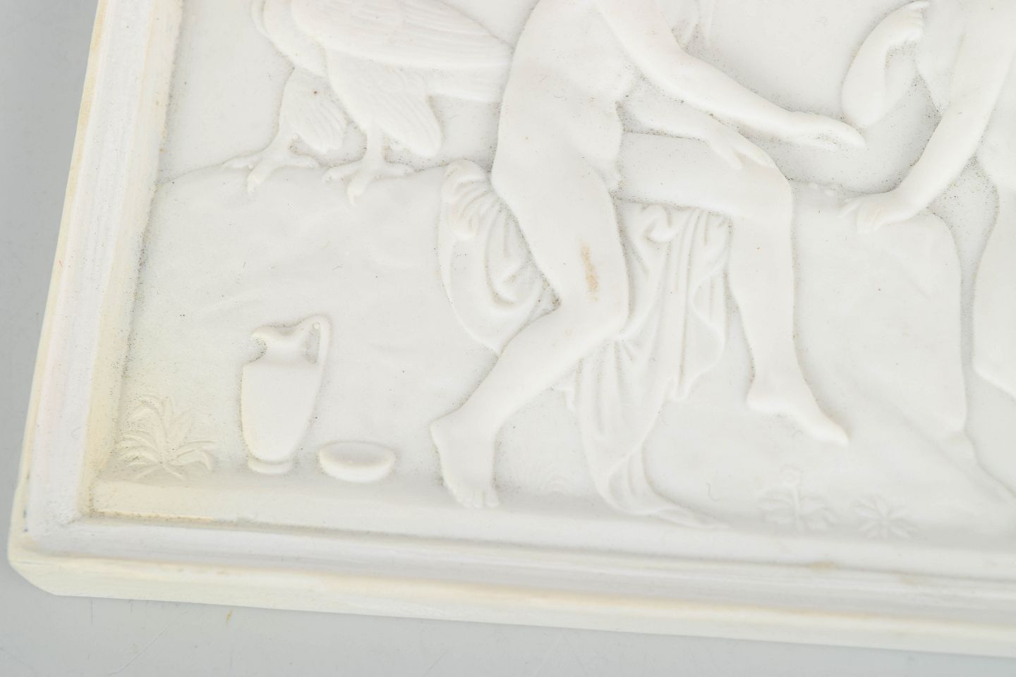 Royal Copenhagen biscuit relief after Thorvaldsen, wall relief.Rectangular wall relief in white biscuit porcelain depicting a classical composition with putti after Bertel Thorvaldsen, executed with refined detailing and soft modelling in the neoclassical style.