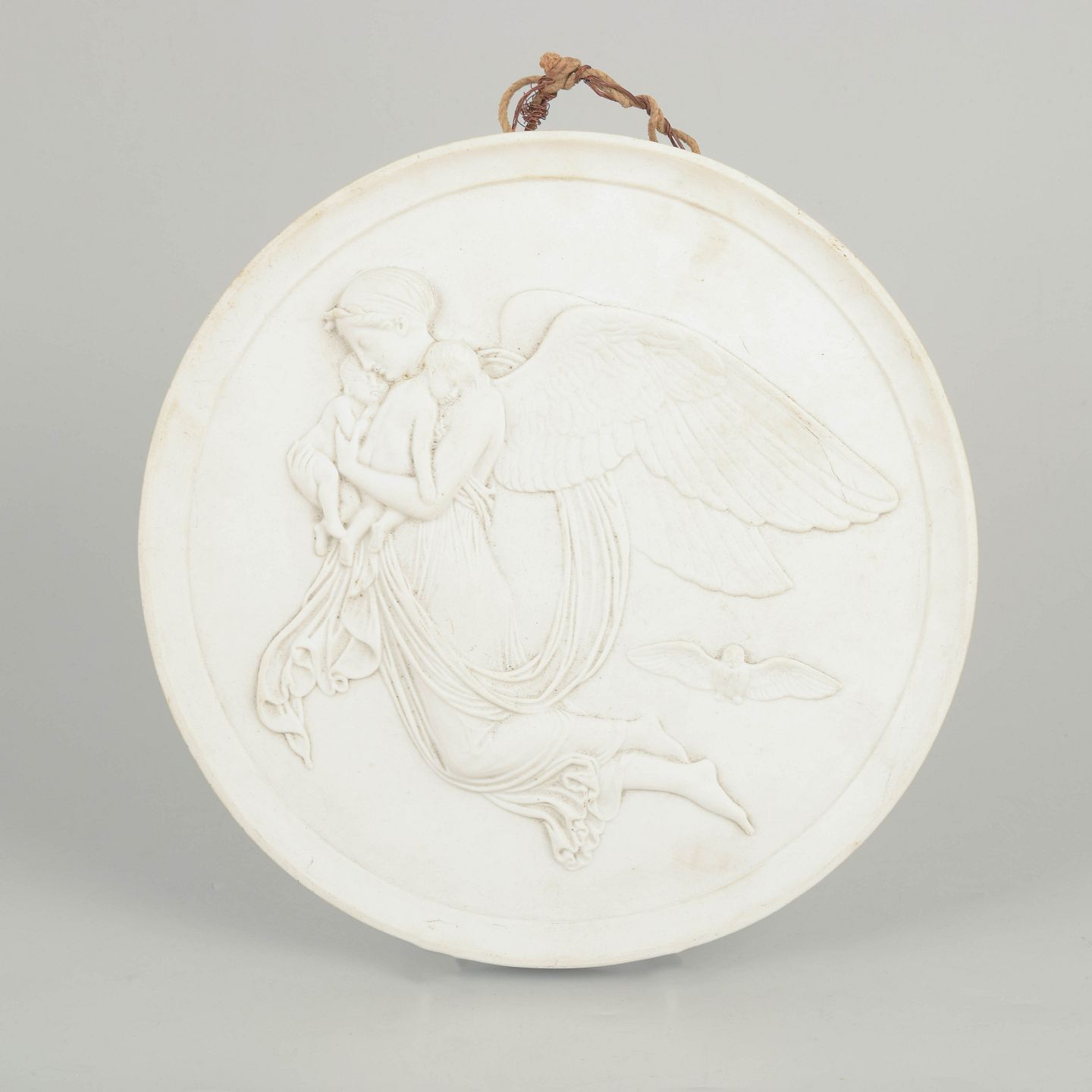 Royal Copenhagen biscuit relief after Thorvaldsen, wall plaque.Circular wall plaque in white biscuit porcelain with a relief depicting an angel motif after Bertel Thorvaldsen, executed with refined neoclassical detailing and soft modelling.