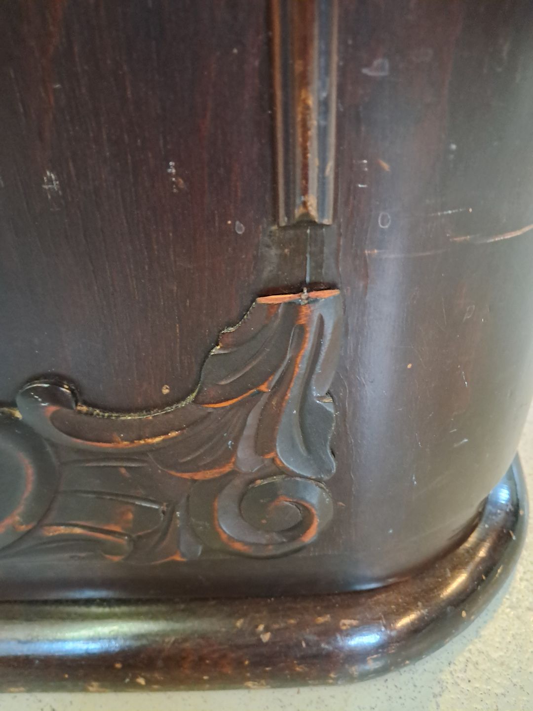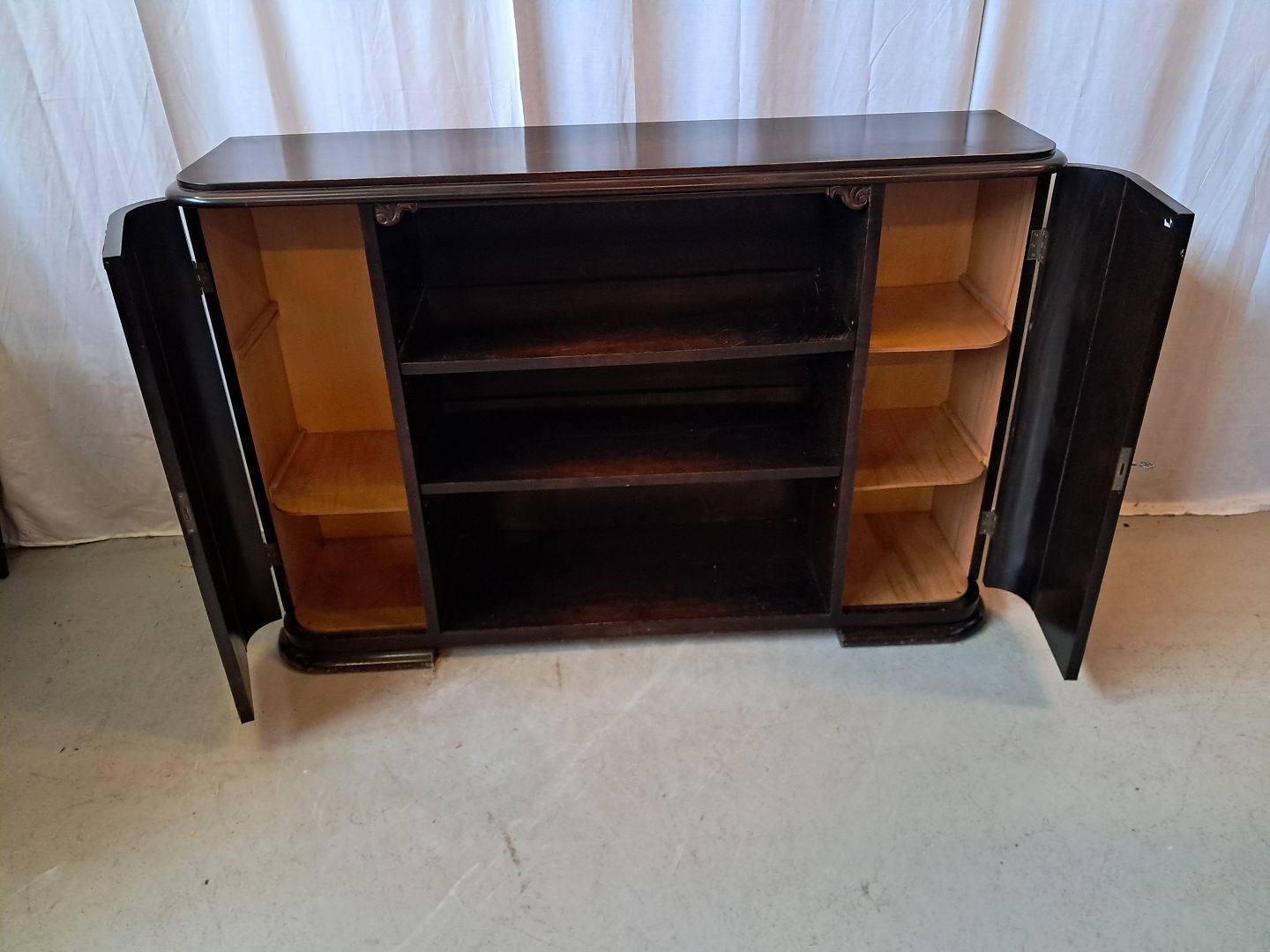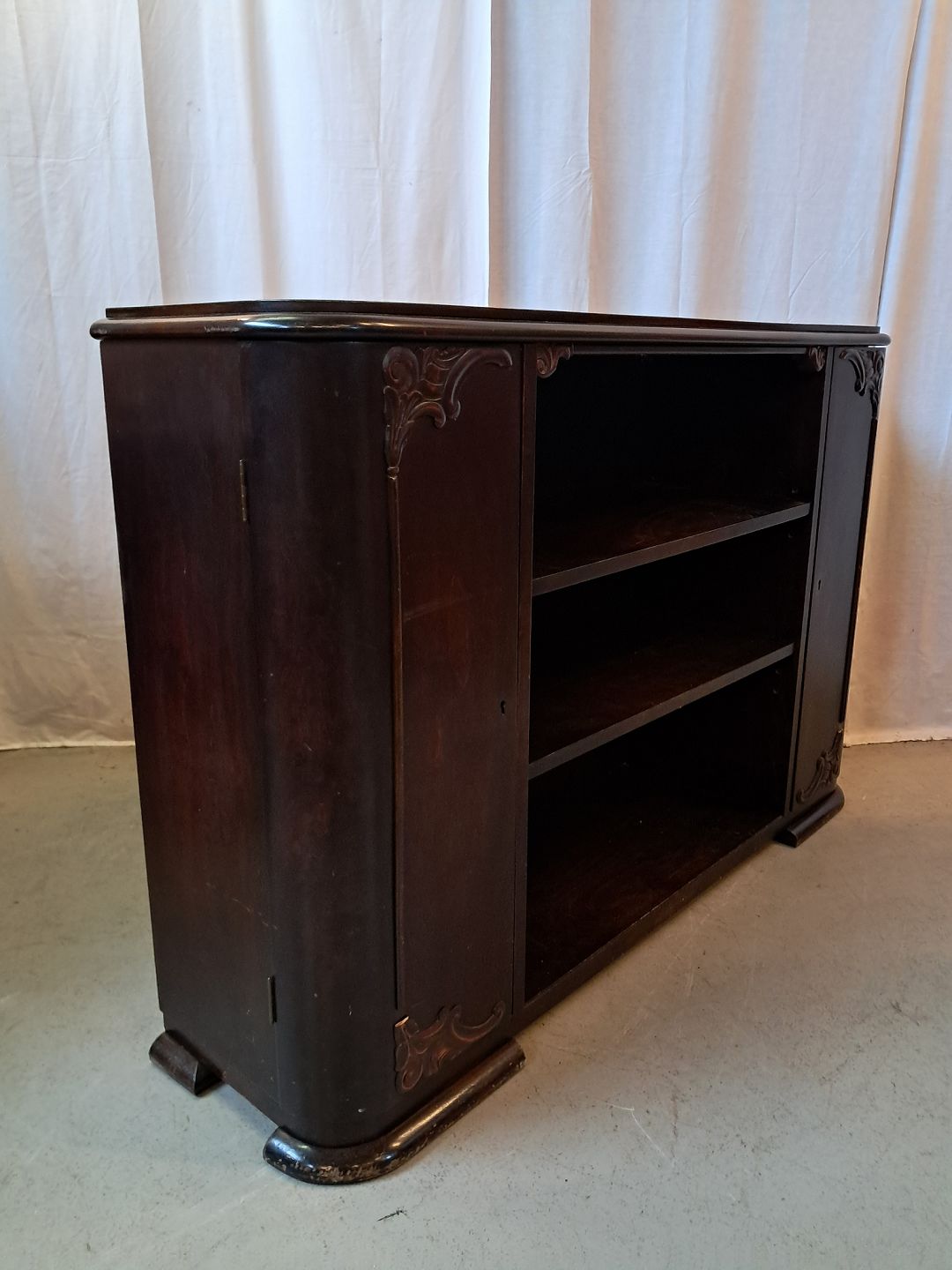 Reol i fineret birketræ, fra 1930erne.Den har en finer defekt og 2 defekter på prydlisterne. (se foto)