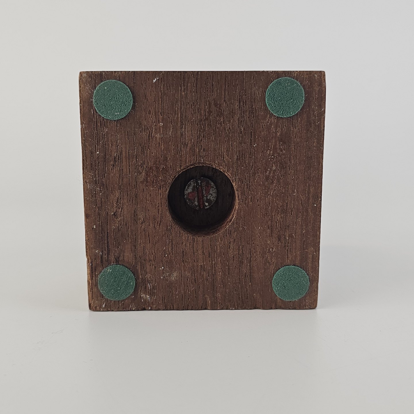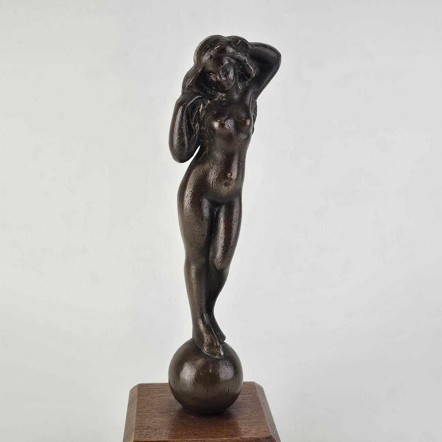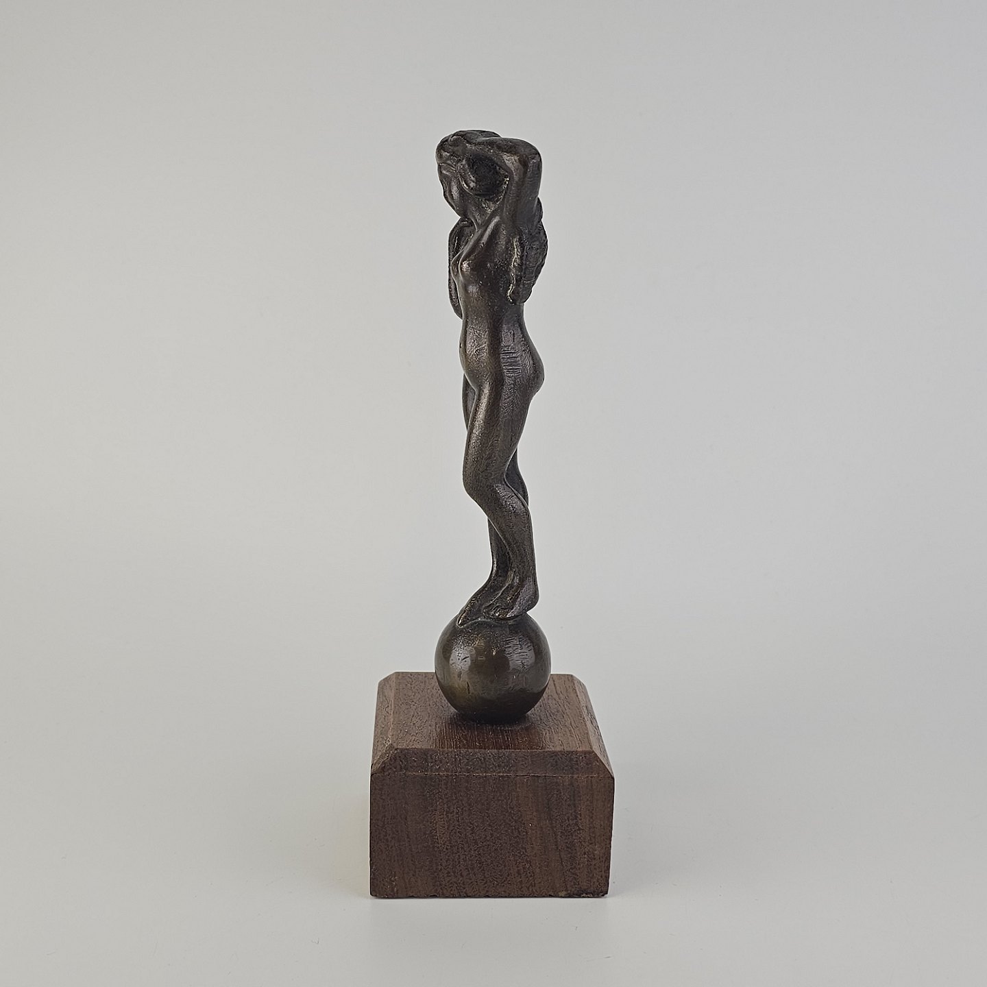 Figur med motiv af en kvinde på træsokkel, bruneret messingFormgiver ukendt