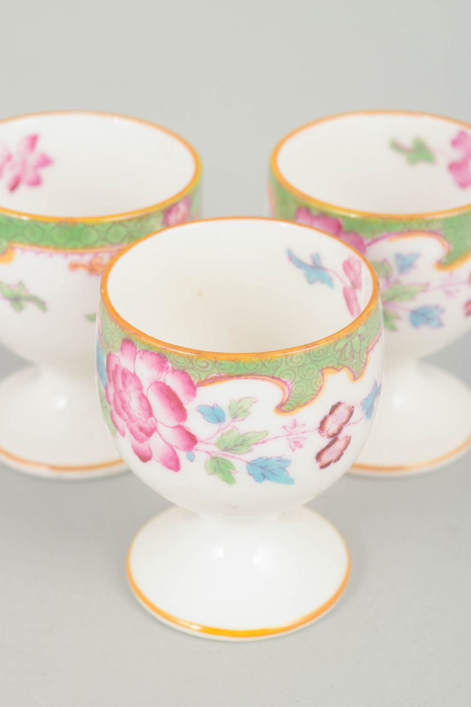 Royal Doulton Temple series set of three egg cups.Decorative porcelain egg cups with colourful floral decoration in the Temple pattern and characteristic green border.