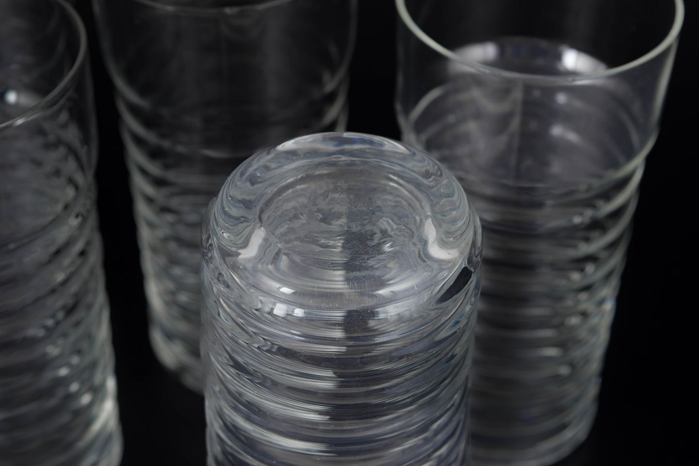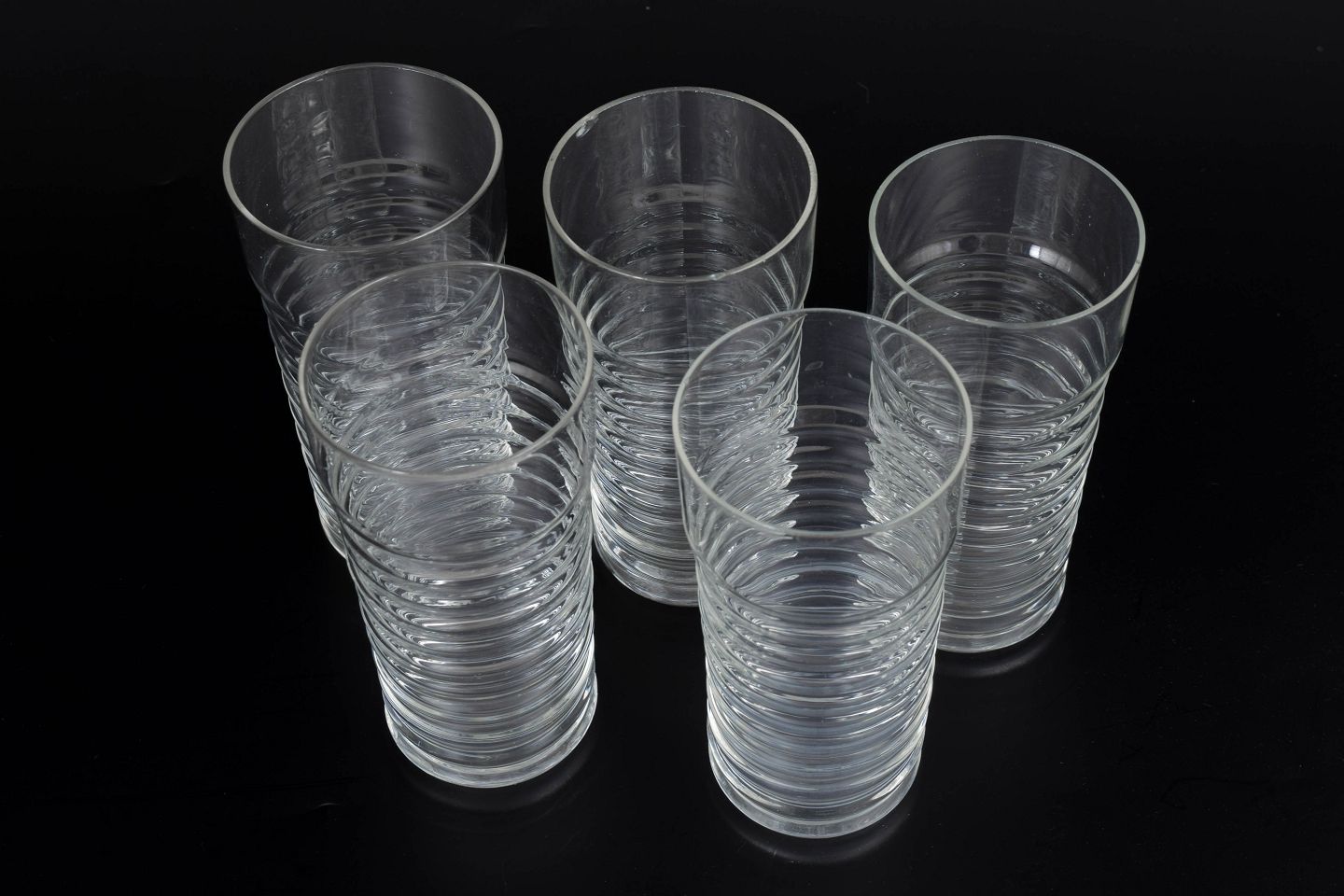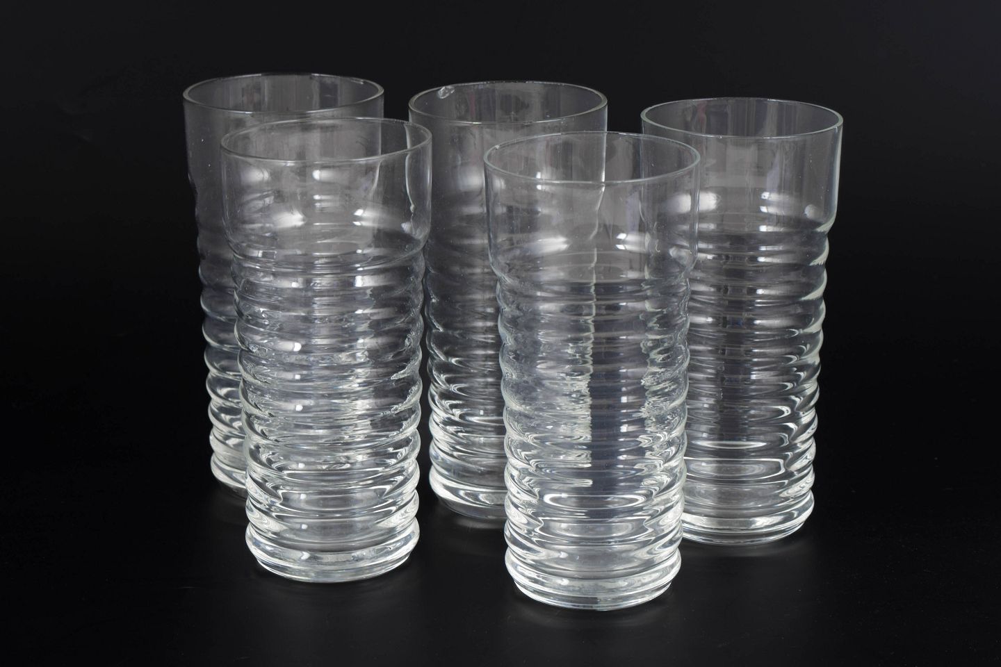 Nanny Still for Riihimäen Lasi, set of five drinking glasses.Clear glass from the Perpetum Mobile series with a distinctive ribbed structure and cylindrical form.