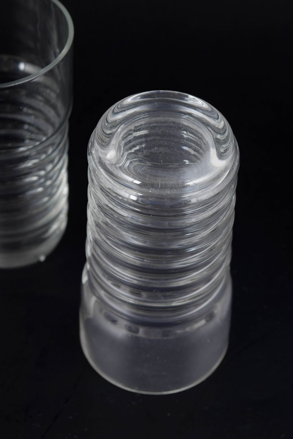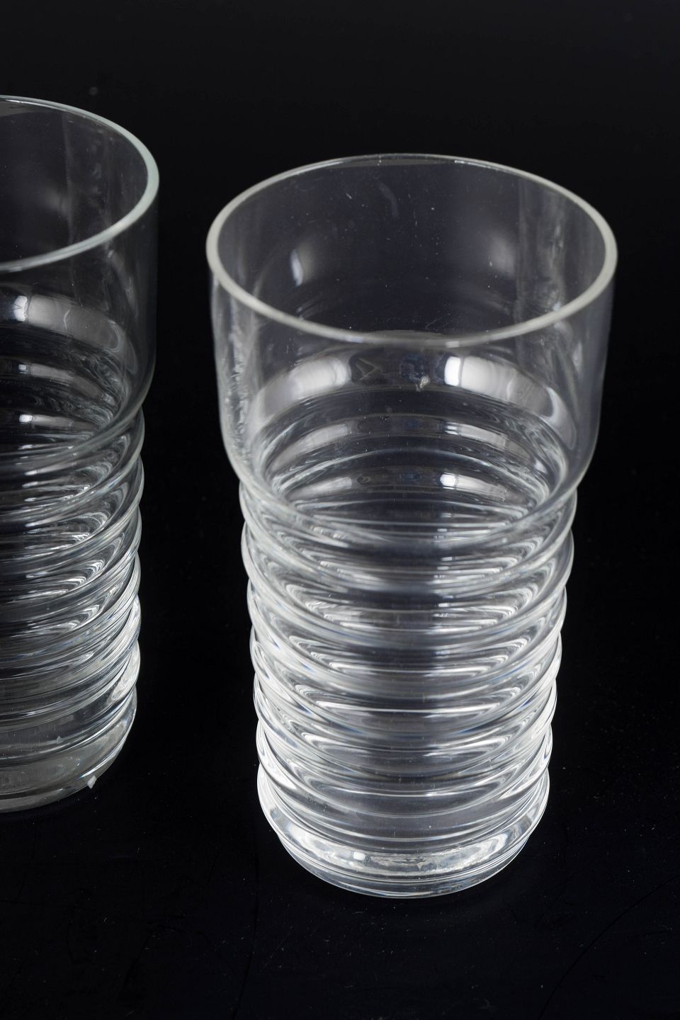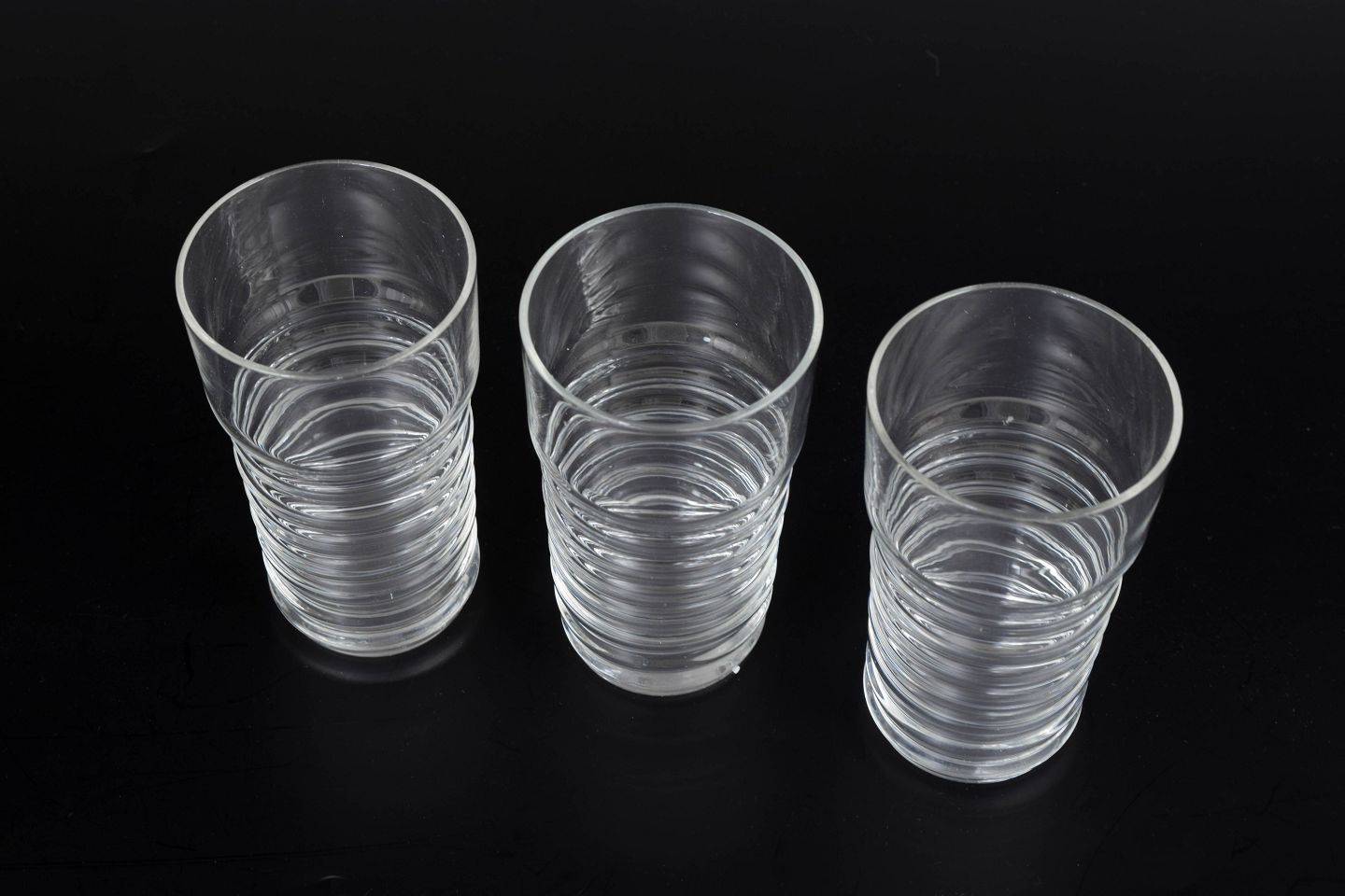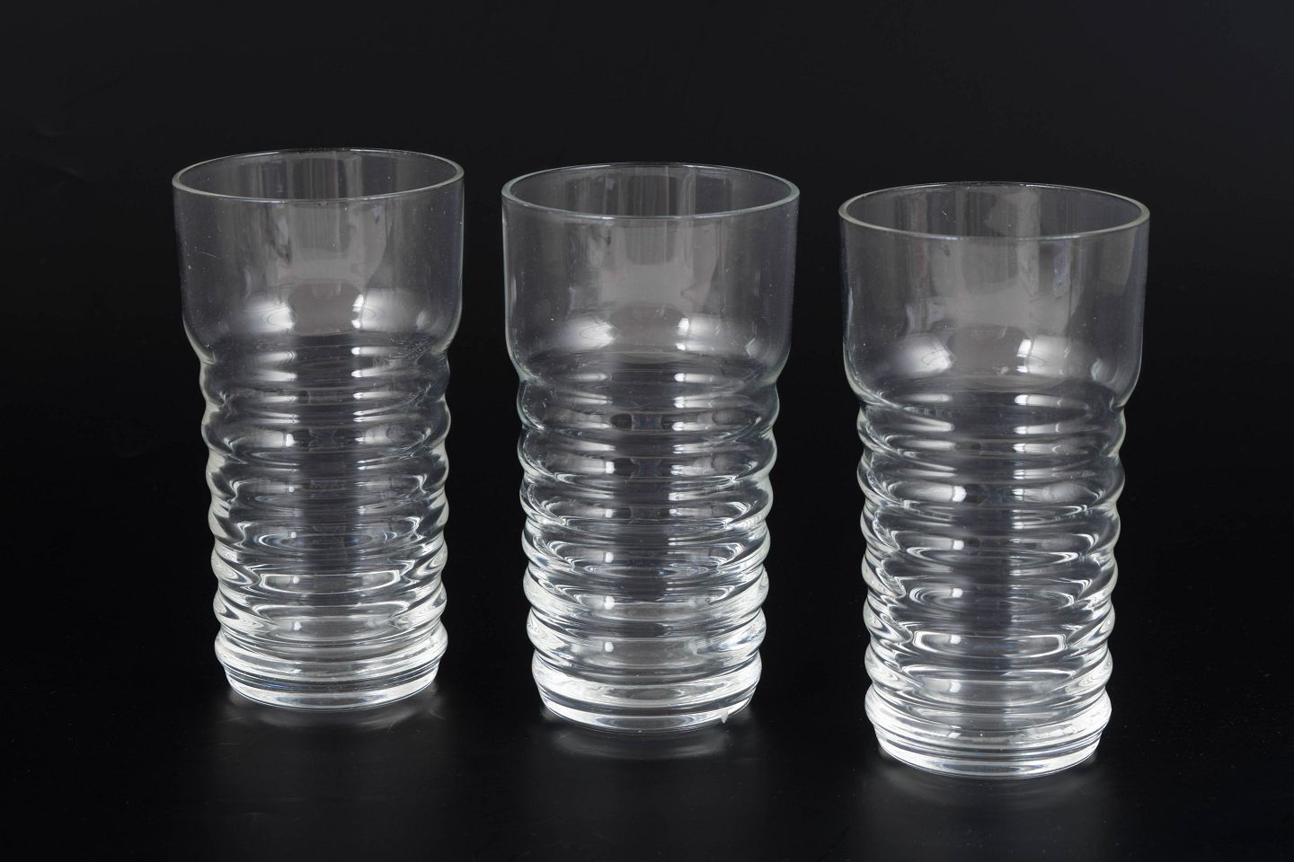 Nanny Still for Riihimäen Lasi, set of three small drinking glasses.Clear glass from the Perpetum Mobile series with a distinctive ribbed structure and cylindrical form.