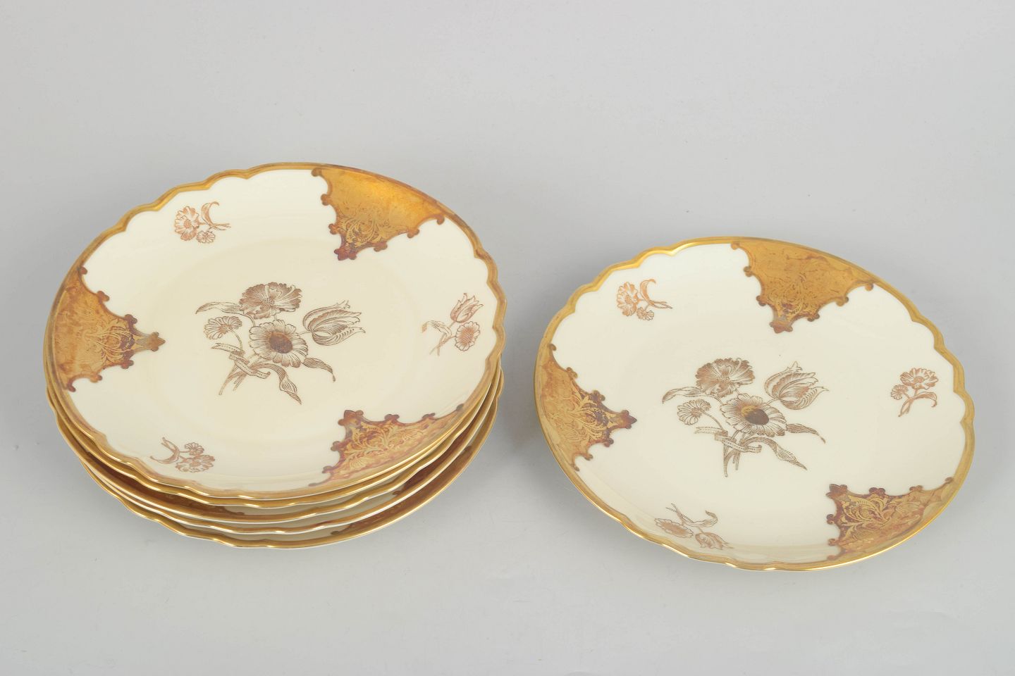 Rosenthal "Elfenbein" series, set of six gold decorated plates.Elegant porcelain plates with ivory-toned relief glaze and richly gilded rims combined with classic floral decoration, produced in Germany during the interwar period.